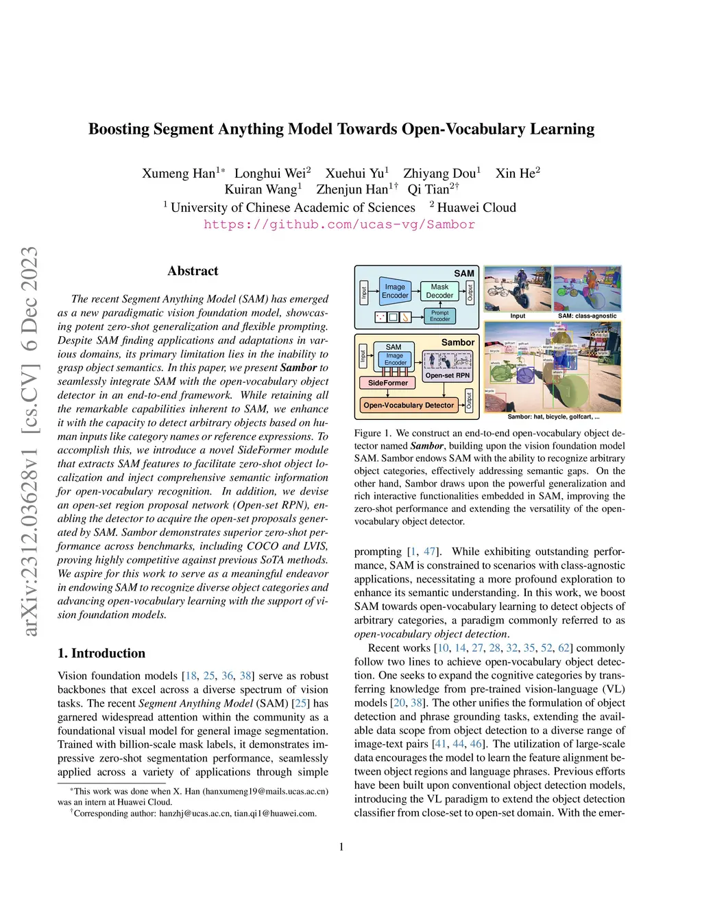 The recent Segment Anything Model (SAM) has emerged as a new paradigmatic vision foundation model, showcasing potent zero-shot generalization and flexible prompting. Despite SAM finding applications and adaptations in various domains, its primary limitation lies in the inability to grasp object semantics. In this paper, we present Sambor to seamlessly integrate SAM with the open-vocabulary object detector in an end-to-end framework. While retaining all the remarkable capabilities inherent to SAM, we boost it to detect arbitrary objects from human inputs like category names or reference expressions. Building upon the SAM image encoder, we introduce a novel SideFormer module designed to acquire SAM features adept at perceiving objects and inject comprehensive semantic information for recognition. In addition, we devise an Open-set RPN that leverages SAM proposals to assist in finding potential objects. Consequently, Sambor enables the open-vocabulary detector to equally focus on generalizing both localization and classification sub-tasks. Our approach demonstrates superior zero-shot performance across benchmarks, including COCO and LVIS, proving highly competitive against previous state-of-the-art methods. We aspire for this work to serve as a meaningful endeavor in endowing SAM to recognize diverse object categories and advancing open-vocabulary learning with the support of vision foundation models.