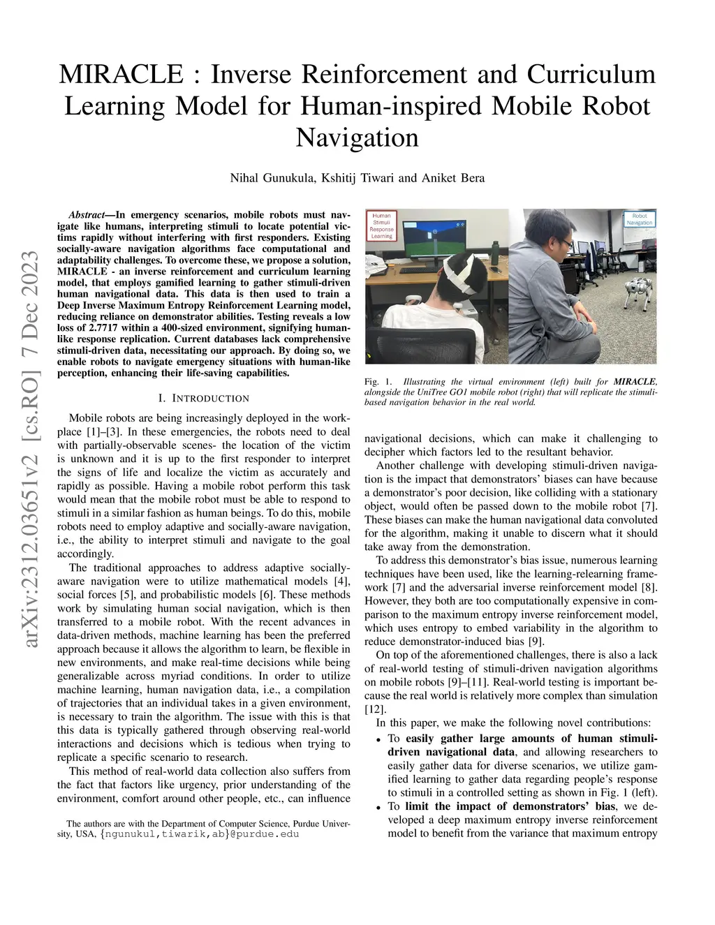 In emergency scenarios, mobile robots must navigate like humans, interpreting stimuli to locate potential victims rapidly without interfering with first responders. Existing socially-aware navigation algorithms face computational and adaptability challenges. To overcome these, we propose a solution, MIRACLE -- an inverse reinforcement and curriculum learning model, that employs gamified learning to gather stimuli-driven human navigational data. This data is then used to train a Deep Inverse Maximum Entropy Reinforcement Learning model, reducing reliance on demonstrator abilities. Testing reveals a low loss of 2.7717 within a 400-sized environment, signifying human-like response replication. Current databases lack comprehensive stimuli-driven data, necessitating our approach. By doing so, we enable robots to navigate emergency situations with human-like perception, enhancing their life-saving capabilities.