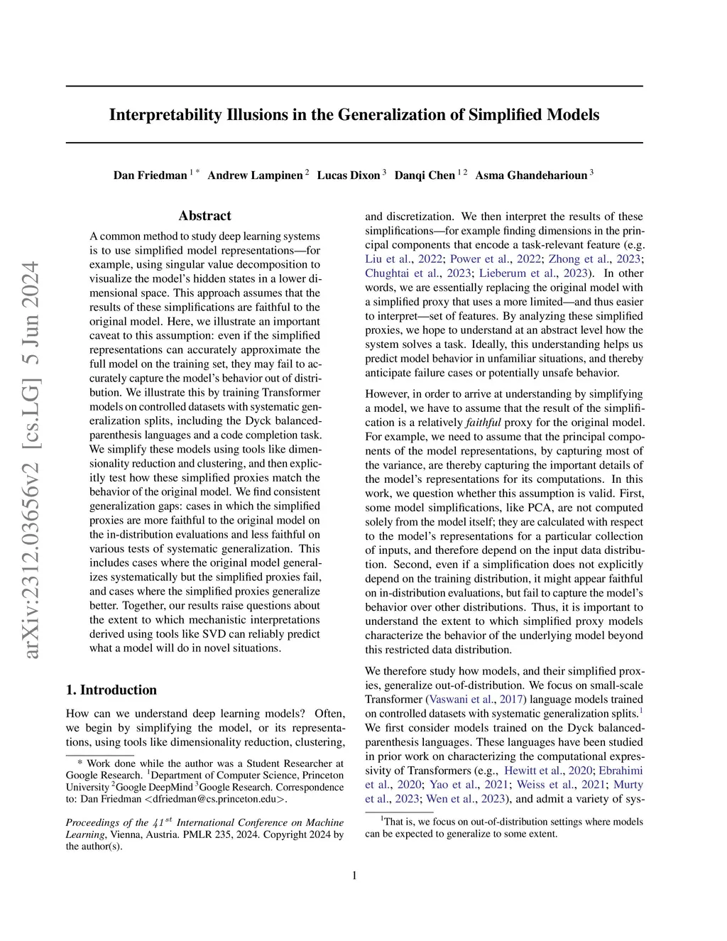 A common method to study deep learning systems is to use simplified model representations -- for example, using singular value decomposition to visualize the model's hidden states in a lower dimensional space. This approach assumes that the results of these simplified are faithful to the original model. Here, we illustrate an important caveat to this assumption: even if the simplified representations can accurately approximate the full model on the training set, they may fail to accurately capture the model's behavior out of distribution -- the understanding developed from simplified representations may be an illusion. We illustrate this by training Transformer models on controlled datasets with systematic generalization splits. First, we train models on the Dyck balanced-parenthesis languages. We simplify these models using tools like dimensionality reduction and clustering, and then explicitly test how these simplified proxies match the behavior of the original model on various out-of-distribution test sets. We find that the simplified proxies are generally less faithful out of distribution. In cases where the original model generalizes to novel structures or deeper depths, the simplified versions may fail, or generalize better. This finding holds even if the simplified representations do not directly depend on the training distribution. Next, we study a more naturalistic task: predicting the next character in a dataset of computer code. We find similar generalization gaps between the original model and simplified proxies, and conduct further analysis to investigate which aspects of the code completion task are associated with the largest gaps. Together, our results raise questions about the extent to which mechanistic interpretations derived using tools like SVD can reliably predict what a model will do in novel situations.