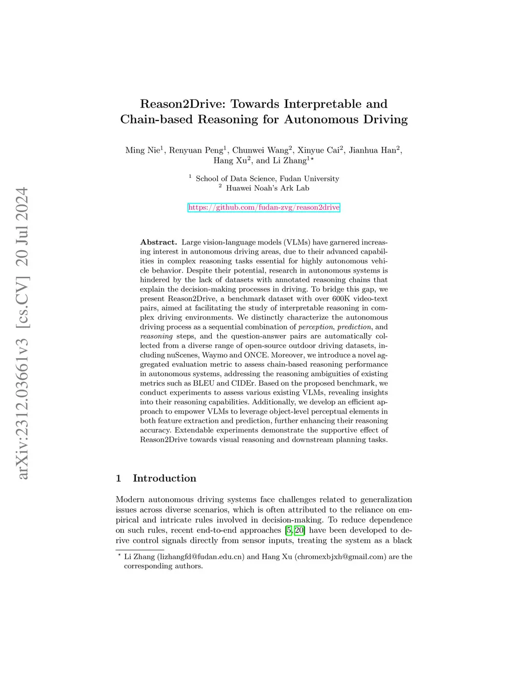 Large vision-language models (VLMs) have garnered increasing interest in autonomous driving areas, due to their advanced capabilities in complex reasoning tasks essential for highly autonomous vehicle behavior. Despite their potential, research in autonomous systems is hindered by the lack of datasets with annotated reasoning chains that explain the decision-making processes in driving. To bridge this gap, we present Reason2Drive, a benchmark dataset with over 600K video-text pairs, aimed at facilitating the study of interpretable reasoning in complex driving environments. We distinctly characterize the autonomous driving process as a sequential combination of perception, prediction, and reasoning steps, and the question-answer pairs are automatically collected from a diverse range of open-source outdoor driving datasets, including nuScenes, Waymo and ONCE. Moreover, we introduce a novel aggregated evaluation metric to assess chain-based reasoning performance in autonomous systems, addressing the semantic ambiguities of existing metrics such as BLEU and CIDEr. Based on the proposed benchmark, we conduct experiments to assess various existing VLMs, revealing insights into their reasoning capabilities. Additionally, we develop an efficient approach to empower VLMs to leverage object-level perceptual elements in both feature extraction and prediction, further enhancing their reasoning accuracy. The code and dataset will be released.
