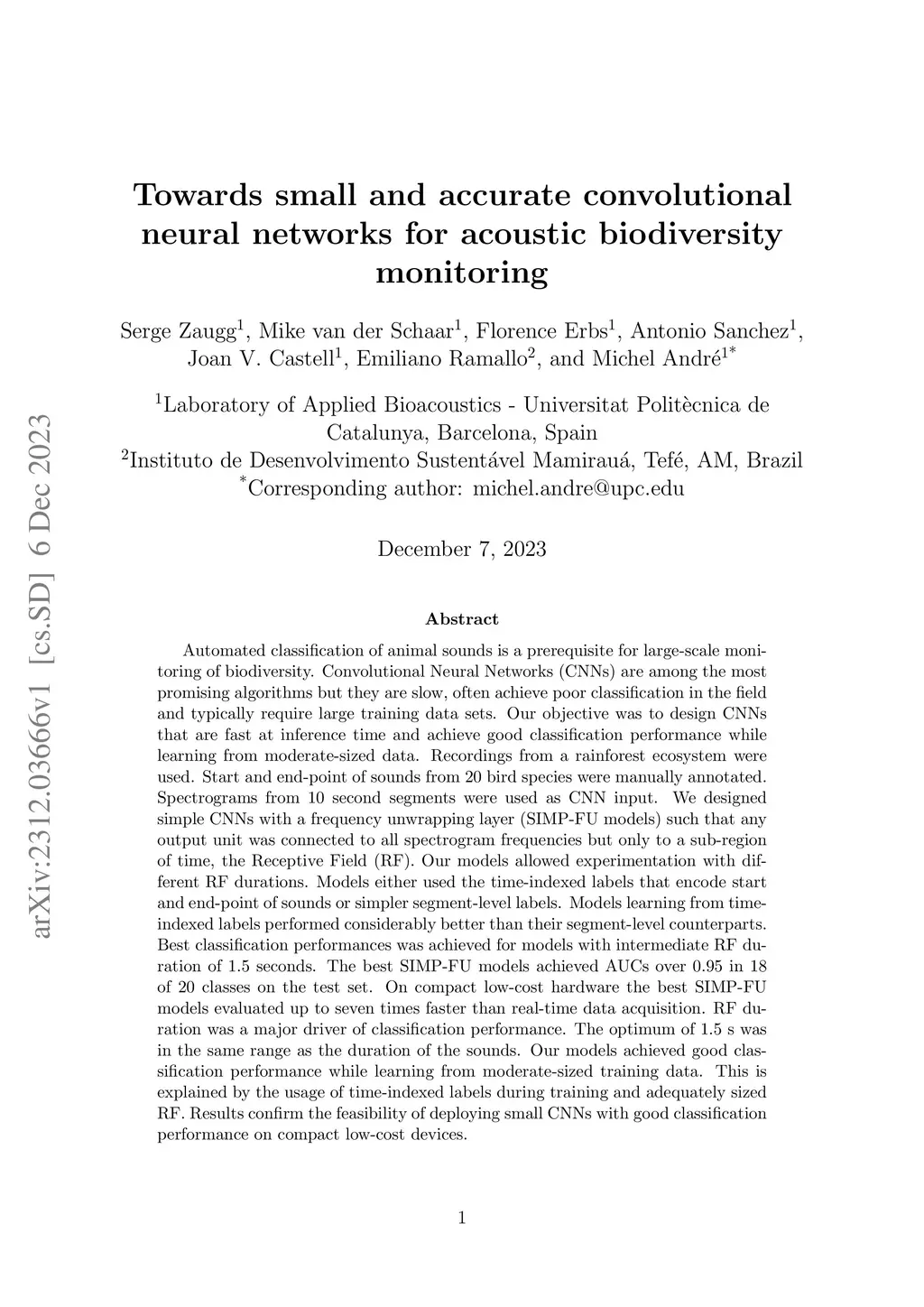 Automated classification of animal sounds is a prerequisite for large-scale monitoring of biodiversity. Convolutional Neural Networks (CNNs) are among the most promising algorithms but they are slow, often achieve poor classification in the field and typically require large training data sets. Our objective was to design CNNs that are fast at inference time and achieve good classification performance while learning from moderate-sized data. Recordings from a rainforest ecosystem were used. Start and end-point of sounds from 20 bird species were manually annotated. Spectrograms from 10 second segments were used as CNN input. We designed simple CNNs with a frequency unwrapping layer (SIMP-FU models) such that any output unit was connected to all spectrogram frequencies but only to a sub-region of time, the Receptive Field (RF). Our models allowed experimentation with different RF durations. Models either used the time-indexed labels that encode start and end-point of sounds or simpler segment-level labels. Models learning from time-indexed labels performed considerably better than their segment-level counterparts. Best classification performances was achieved for models with intermediate RF duration of 1.5 seconds. The best SIMP-FU models achieved AUCs over 0.95 in 18 of 20 classes on the test set. On compact low-cost hardware the best SIMP-FU models evaluated up to seven times faster than real-time data acquisition. RF duration was a major driver of classification performance. The optimum of 1.5 s was in the same range as the duration of the sounds. Our models achieved good classification performance while learning from moderate-sized training data. This is explained by the usage of time-indexed labels during training and adequately sized RF. Results confirm the feasibility of deploying small CNNs with good classification performance on compact low-cost devices.