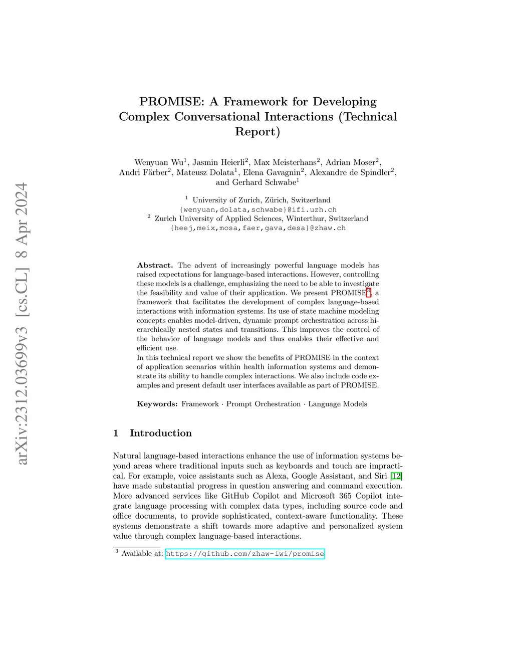 The advent of increasingly powerful language models has raised expectations for language-based interactions. However, controlling these models is a challenge, emphasizing the need to be able to investigate the feasibility and value of their application. We present PROMISE, a framework that facilitates the development of complex language-based interactions with information systems. Its use of state machine modeling concepts enables model-driven, dynamic prompt orchestration across hierarchically nested states and transitions. This improves the control of the behavior of language models and thus enables their effective and efficient use. In this technical report we show the benefits of PROMISE in the context of application scenarios within health information systems and demonstrate its ability to handle complex interactions. We also include code examples and present default user interfaces available as part of PROMISE.