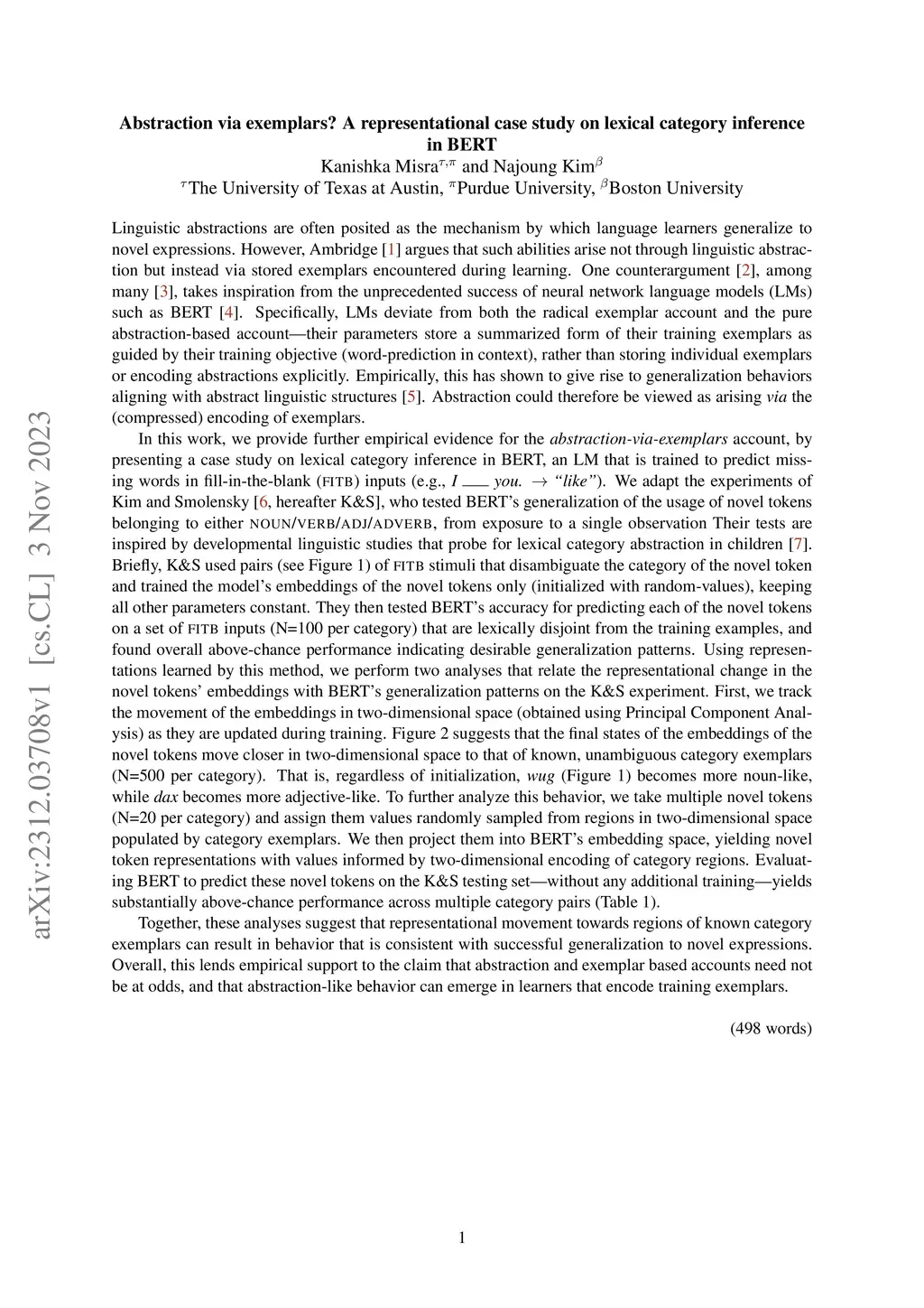 Exemplar based accounts are often considered to be in direct opposition to pure linguistic abstraction in explaining language learners' ability to generalize to novel expressions. However, the recent success of neural network language models on linguistically sensitive tasks suggests that perhaps abstractions can arise via the encoding of exemplars. We provide empirical evidence for this claim by adapting an existing experiment that studies how an LM (BERT) generalizes the usage of novel tokens that belong to lexical categories such as Noun/Verb/Adjective/Adverb from exposure to only a single instance of their usage. We analyze the representational behavior of the novel tokens in these experiments, and find that BERT's capacity to generalize to unseen expressions involving the use of these novel tokens constitutes the movement of novel token representations towards regions of known category exemplars in two-dimensional space. Our results suggest that learners' encoding of exemplars can indeed give rise to abstraction like behavior.