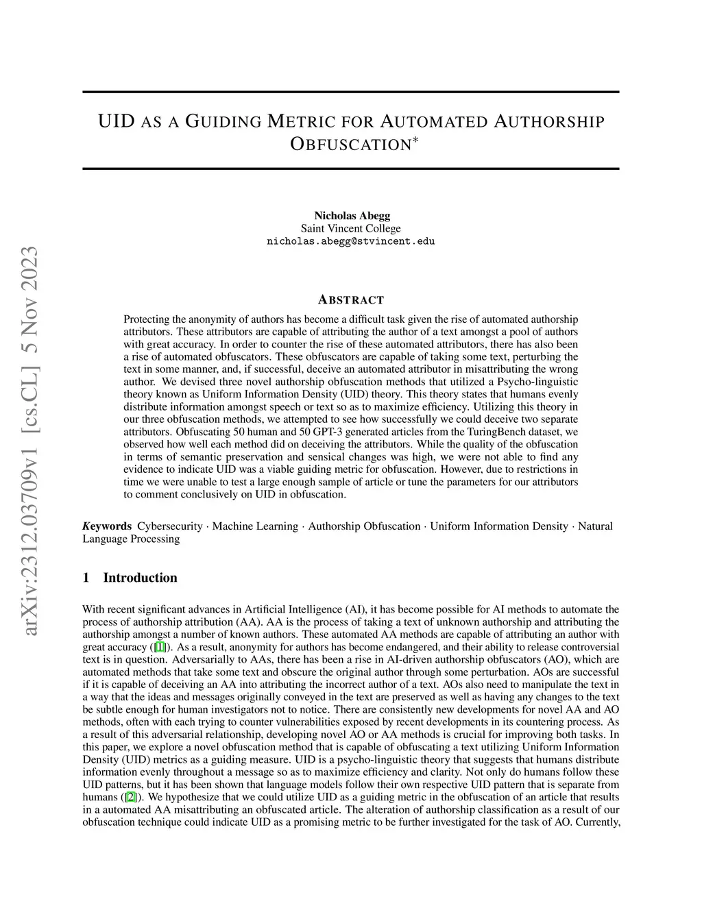 Protecting the anonymity of authors has become a difficult task given the rise of automated authorship attributors. These attributors are capable of attributing the author of a text amongst a pool of authors with great accuracy. In order to counter the rise of these automated attributors, there has also been a rise of automated obfuscators. These obfuscators are capable of taking some text, perturbing the text in some manner, and, if successful, deceive an automated attributor in misattributing the wrong author. We devised three novel authorship obfuscation methods that utilized a Psycho-linguistic theory known as Uniform Information Density (UID) theory. This theory states that humans evenly distribute information amongst speech or text so as to maximize efficiency. Utilizing this theory in our three obfuscation methods, we attempted to see how successfully we could deceive two separate attributors. Obfuscating 50 human and 50 GPT-3 generated articles from the TuringBench dataset, we observed how well each method did on deceiving the attributors. While the quality of the obfuscation in terms of semantic preservation and sensical changes was high, we were not able to find any evidence to indicate UID was a viable guiding metric for obfuscation. However, due to restrictions in time we were unable to test a large enough sample of article or tune the parameters for our attributors to comment conclusively on UID in obfuscation.