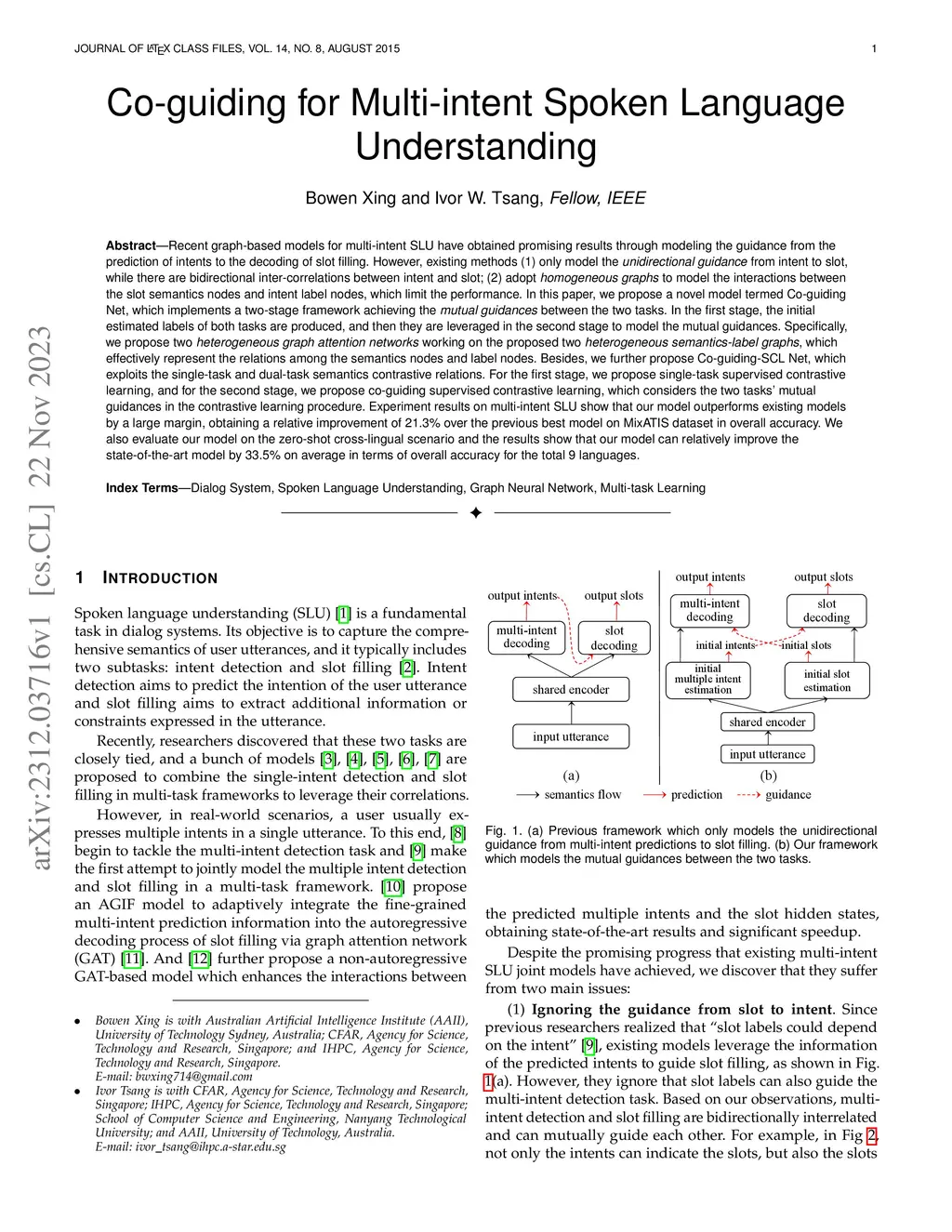 Recent graph-based models for multi-intent SLU have obtained promising results through modeling the guidance from the prediction of intents to the decoding of slot filling. However, existing methods (1) only model the unidirectional guidance from intent to slot, while there are bidirectional inter-correlations between intent and slot; (2) adopt homogeneous graphs to model the interactions between the slot semantics nodes and intent label nodes, which limit the performance. In this paper, we propose a novel model termed Co-guiding Net, which implements a two-stage framework achieving the mutual guidances between the two tasks. In the first stage, the initial estimated labels of both tasks are produced, and then they are leveraged in the second stage to model the mutual guidances. Specifically, we propose two heterogeneous graph attention networks working on the proposed two heterogeneous semantics label graphs, which effectively represent the relations among the semantics nodes and label nodes. Besides, we further propose Co-guiding-SCL Net, which exploits the single-task and dual-task semantics contrastive relations. For the first stage, we propose single-task supervised contrastive learning, and for the second stage, we propose co-guiding supervised contrastive learning, which considers the two tasks' mutual guidances in the contrastive learning procedure. Experiment results on multi-intent SLU show that our model outperforms existing models by a large margin, obtaining a relative improvement of 21.3% over the previous best model on MixATIS dataset in overall accuracy. We also evaluate our model on the zero-shot cross-lingual scenario and the results show that our model can relatively improve the state-of-the-art model by 33.5% on average in terms of overall accuracy for the total 9 languages.