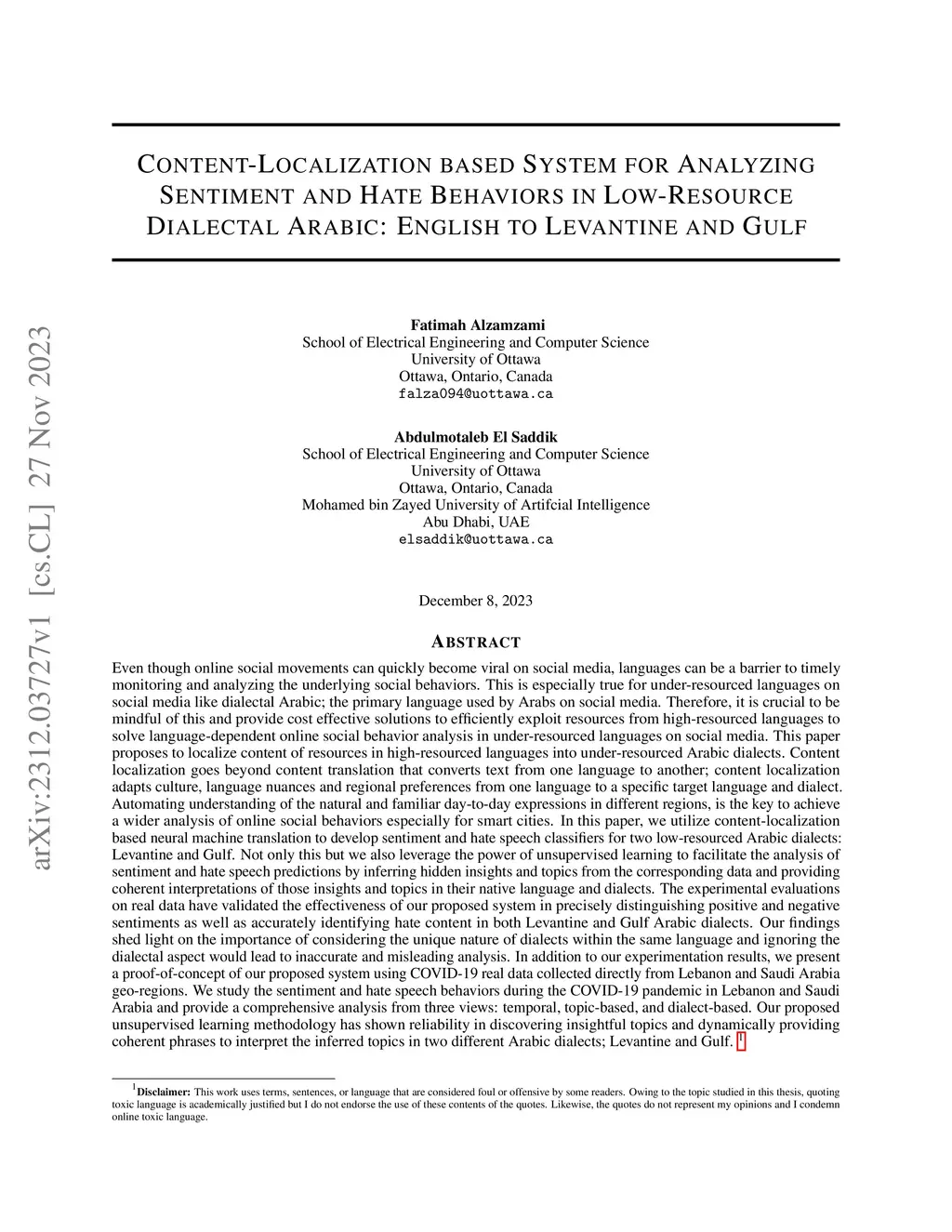 Content-Localization based System for Analyzing Sentiment and Hate