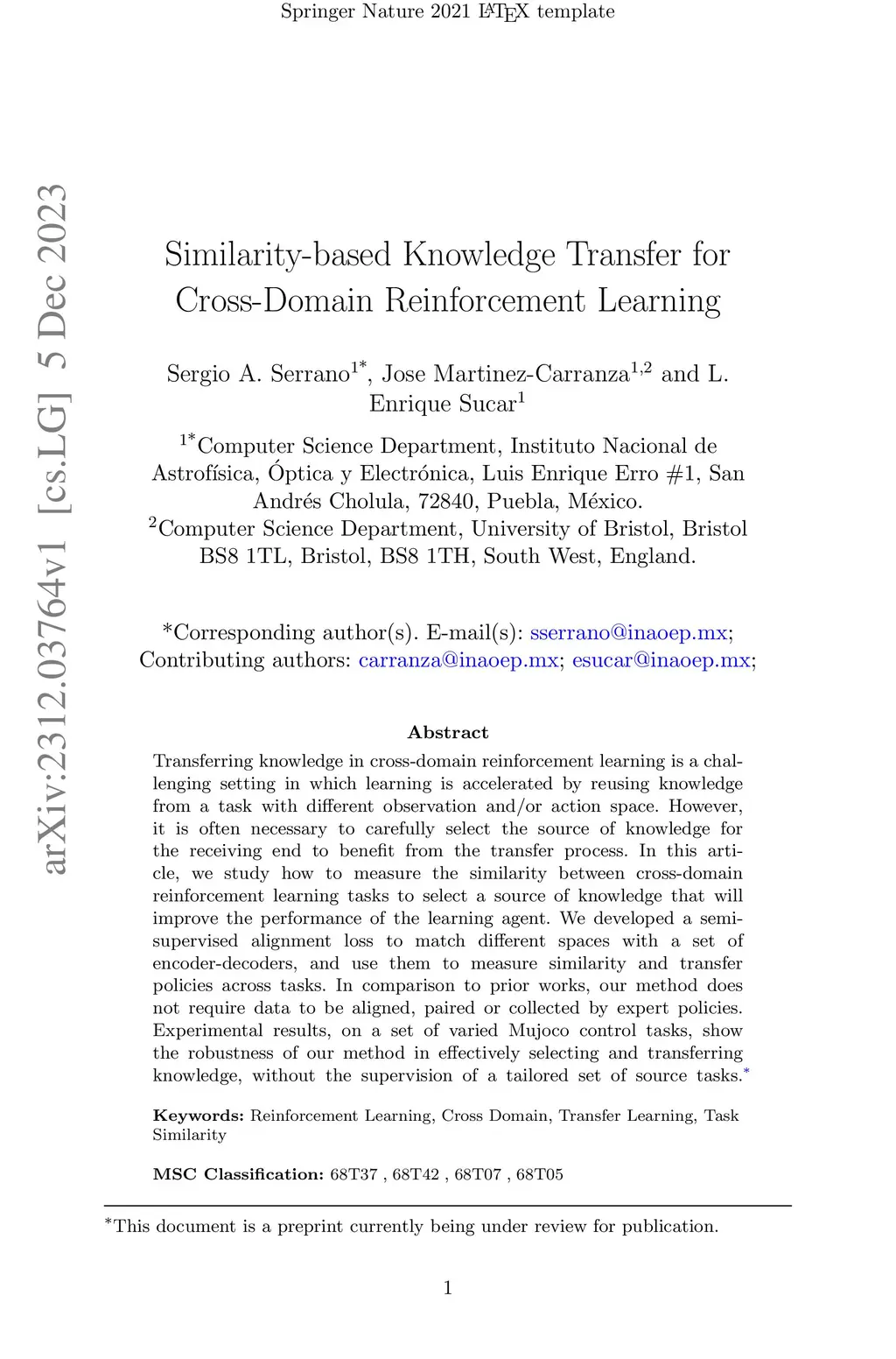 Transferring knowledge in cross-domain reinforcement learning is a challenging setting in which learning is accelerated by reusing knowledge from a task with different observation and/or action space. However, it is often necessary to carefully select the source of knowledge for the receiving end to benefit from the transfer process. In this article, we study how to measure the similarity between cross-domain reinforcement learning tasks to select a source of knowledge that will improve the performance of the learning agent. We developed a semi-supervised alignment loss to match different spaces with a set of encoder-decoders, and use them to measure similarity and transfer policies across tasks. In comparison to prior works, our method does not require data to be aligned, paired or collected by expert policies. Experimental results, on a set of varied Mujoco control tasks, show the robustness of our method in effectively selecting and transferring knowledge, without the supervision of a tailored set of source tasks.
