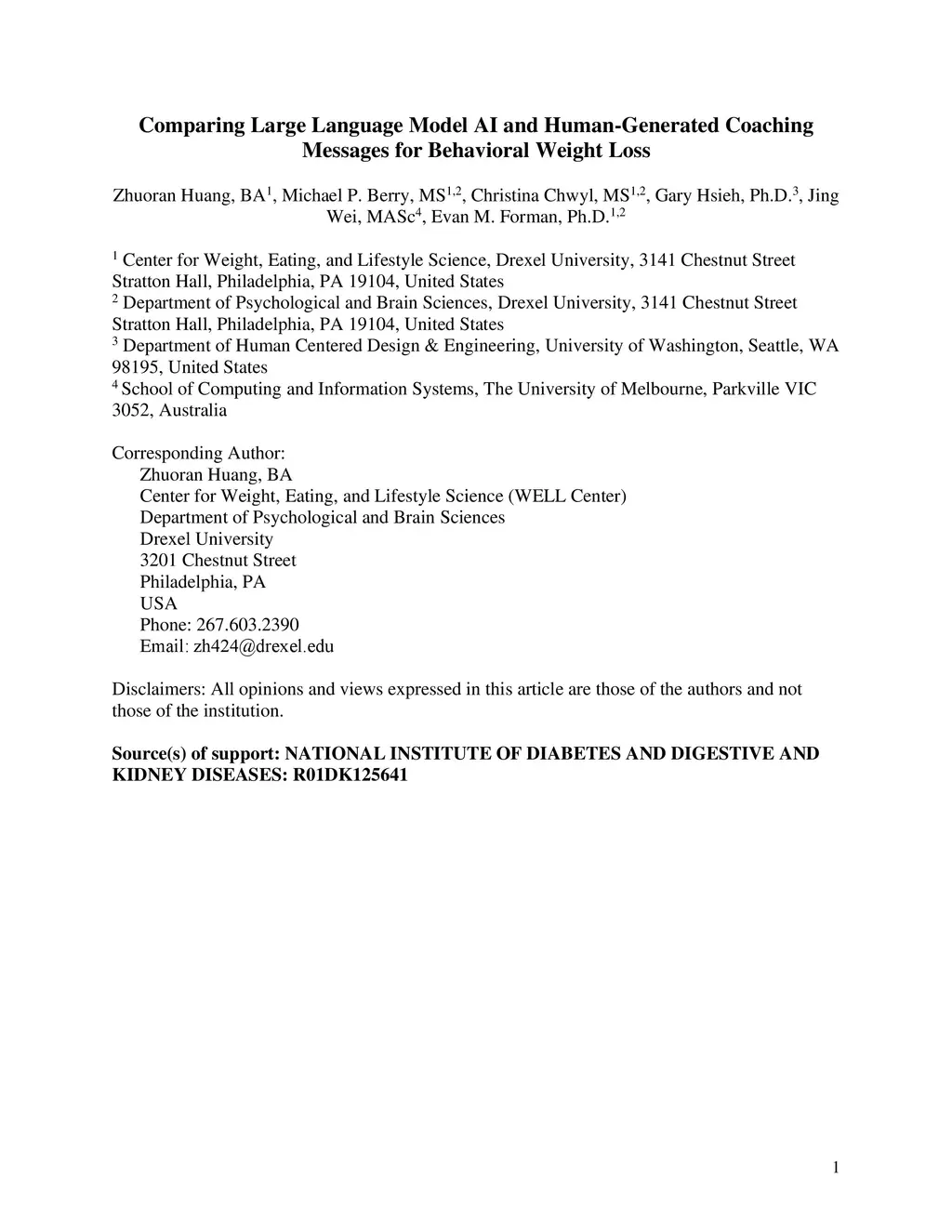 Comparing Large Language Model AI and Human-Generated Coaching Messages for Behavioral Weight Loss