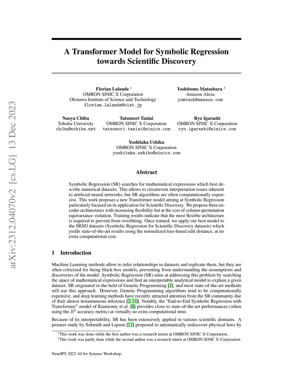 Symbolic Regression (SR) searches for mathematical expressions which best describe numerical datasets. This allows to circumvent interpretation issues inherent to artificial neural networks, but SR algorithms are often computationally expensive. This work proposes a new Transformer model aiming at Symbolic Regression particularly focused on its application for Scientific Discovery. We propose three encoder architectures with increasing flexibility but at the cost of column-permutation equivariance violation. Training results indicate that the most flexible architecture is required to prevent from overfitting. Once trained, we apply our best model to the SRSD datasets (Symbolic Regression for Scientific Discovery datasets) which yields state-of-the-art results using the normalized tree-based edit distance, at no extra computational cost.