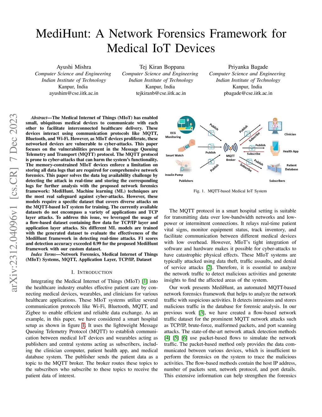 The Medical Internet of Things (MIoT) has enabled small, ubiquitous medical devices to communicate with each other to facilitate interconnected healthcare delivery. These devices interact using communication protocols like MQTT, Bluetooth, and Wi-Fi. However, as MIoT devices proliferate, these networked devices are vulnerable to cyber-attacks. This paper focuses on the vulnerabilities present in the Message Queuing Telemetry and Transport (MQTT) protocol. The MQTT protocol is prone to cyber-attacks that can harm the system's functionality. The memory-constrained MIoT devices enforce a limitation on storing all data logs that are required for comprehensive network forensics. This paper solves the data log availability challenge by detecting the attack in real-time and storing the corresponding logs for further analysis with the proposed network forensics framework: MediHunt. Machine learning (ML) techniques are the most real safeguard against cyber-attacks. However, these models require a specific dataset that covers diverse attacks on the MQTT-based IoT system for training. The currently available datasets do not encompass a variety of applications and TCP layer attacks. To address this issue, we leveraged the usage of a flow-based dataset containing flow data for TCP/IP layer and application layer attacks. Six different ML models are trained with the generated dataset to evaluate the effectiveness of the MediHunt framework in detecting real-time attacks. F1 scores and detection accuracy exceeded 0.99 for the proposed MediHunt framework with our custom dataset.