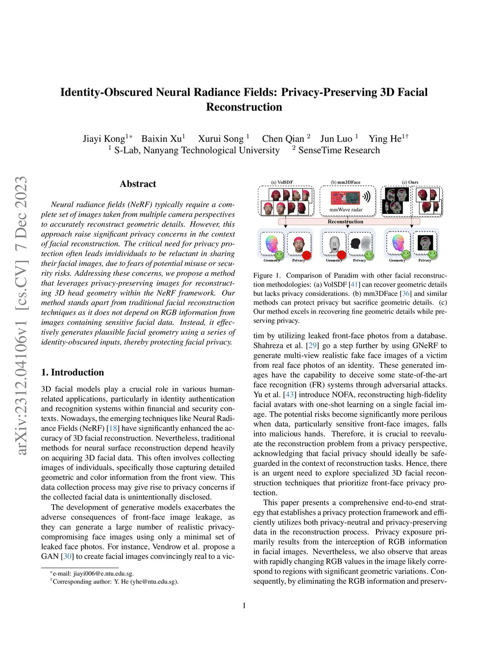 Neural radiance fields (NeRF) typically require a complete set of images taken from multiple camera perspectives to accurately reconstruct geometric details. However, this approach raise significant privacy concerns in the context of facial reconstruction. The critical need for privacy protection often leads invidividuals to be reluctant in sharing their facial images, due to fears of potential misuse or security risks. Addressing these concerns, we propose a method that leverages privacy-preserving images for reconstructing 3D head geometry within the NeRF framework. Our method stands apart from traditional facial reconstruction techniques as it does not depend on RGB information from images containing sensitive facial data. Instead, it effectively generates plausible facial geometry using a series of identity-obscured inputs, thereby protecting facial privacy.