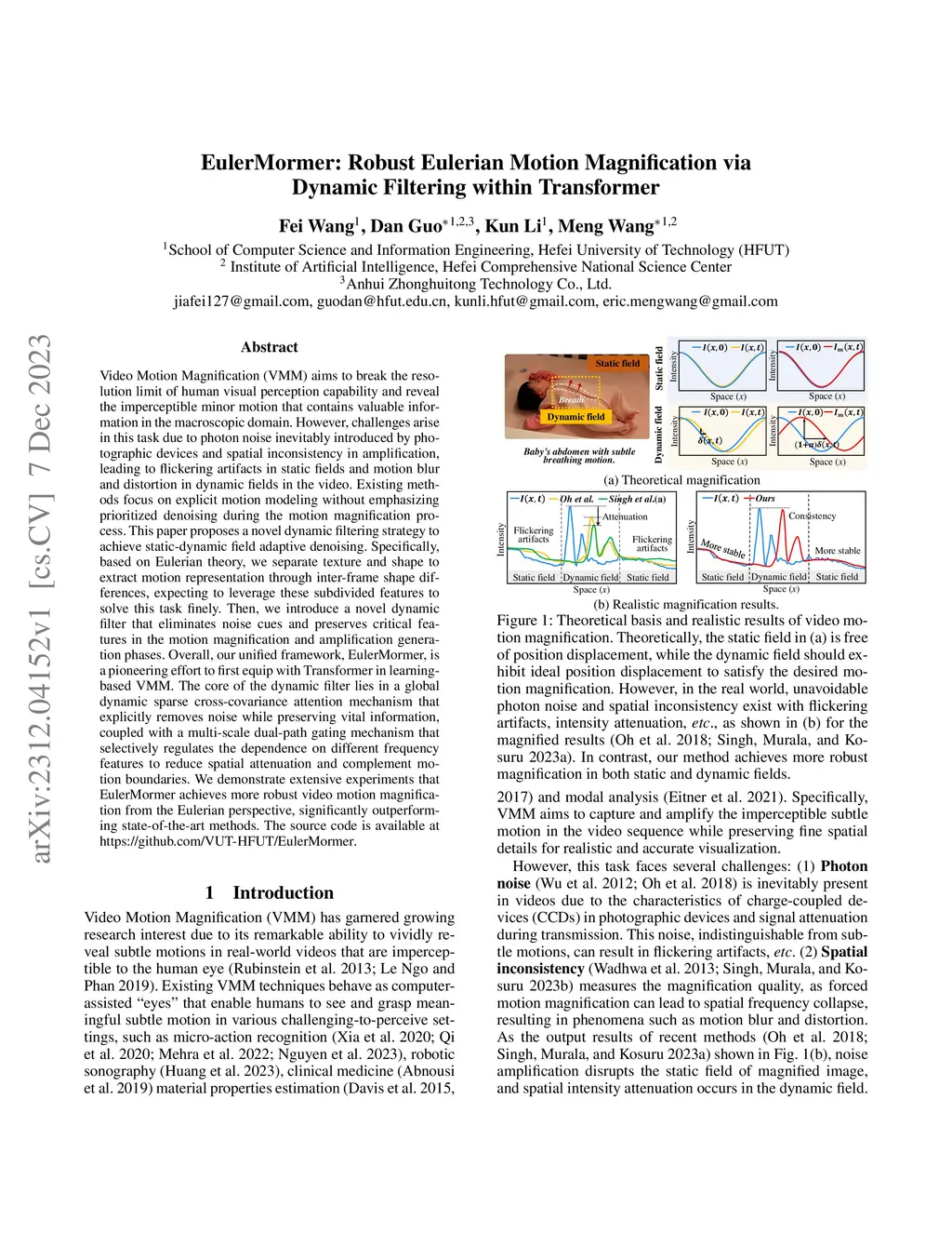 Video Motion Magnification (VMM) aims to break the resolution limit of human visual perception capability and reveal the imperceptible minor motion that contains valuable information in the macroscopic domain. However, challenges arise in this task due to photon noise inevitably introduced by photographic devices and spatial inconsistency in amplification, leading to flickering artifacts in static fields and motion blur and distortion in dynamic fields in the video. Existing methods focus on explicit motion modeling without emphasizing prioritized denoising during the motion magnification process. This paper proposes a novel dynamic filtering strategy to achieve static-dynamic field adaptive denoising. Specifically, based on Eulerian theory, we separate texture and shape to extract motion representation through inter-frame shape differences, expecting to leverage these subdivided features to solve this task finely. Then, we introduce a novel dynamic filter that eliminates noise cues and preserves critical features in the motion magnification and amplification generation phases. Overall, our unified framework, EulerMormer, is a pioneering effort to first equip with Transformer in learning-based VMM. The core of the dynamic filter lies in a global dynamic sparse cross-covariance attention mechanism that explicitly removes noise while preserving vital information, coupled with a multi-scale dual-path gating mechanism that selectively regulates the dependence on different frequency features to reduce spatial attenuation and complement motion boundaries. We demonstrate extensive experiments that EulerMormer achieves more robust video motion magnification from the Eulerian perspective, significantly outperforming state-of-the-art methods. The source code is available at https://github.com/VUT-HFUT/EulerMormer.