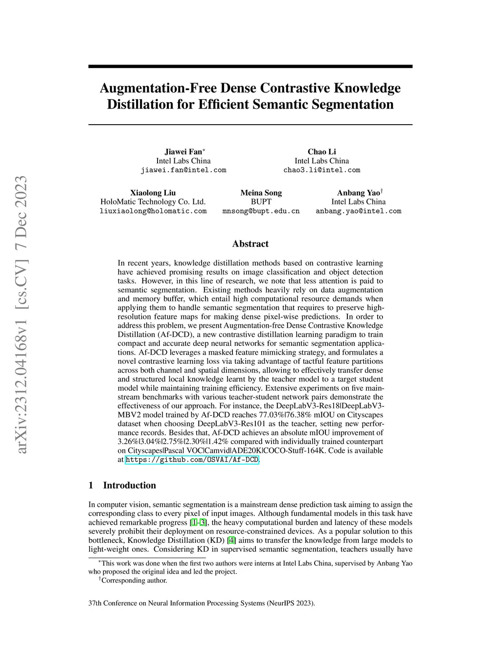 In recent years, knowledge distillation methods based on contrastive learning have achieved promising results on image classification and object detection tasks. However, in this line of research, we note that less attention is paid to semantic segmentation. Existing methods heavily rely on data augmentation and memory buffer, which entail high computational resource demands when applying them to handle semantic segmentation that requires to preserve high-resolution feature maps for making dense pixel-wise predictions. In order to address this problem, we present Augmentation-free Dense Contrastive Knowledge Distillation (Af-DCD), a new contrastive distillation learning paradigm to train compact and accurate deep neural networks for semantic segmentation applications. Af-DCD leverages a masked feature mimicking strategy, and formulates a novel contrastive learning loss via taking advantage of tactful feature partitions across both channel and spatial dimensions, allowing to effectively transfer dense and structured local knowledge learnt by the teacher model to a target student model while maintaining training efficiency. Extensive experiments on five mainstream benchmarks with various teacher-student network pairs demonstrate the effectiveness of our approach. For instance, the DeepLabV3-Res18|DeepLabV3-MBV2 model trained by Af-DCD reaches 77.03%|76.38% mIOU on Cityscapes dataset when choosing DeepLabV3-Res101 as the teacher, setting new performance records. Besides that, Af-DCD achieves an absolute mIOU improvement of 3.26%|3.04%|2.75%|2.30%|1.42% compared with individually trained counterpart on Cityscapes|Pascal VOC|Camvid|ADE20K|COCO-Stuff-164K. Code is available at https://github.com/OSVAI/Af-DCD