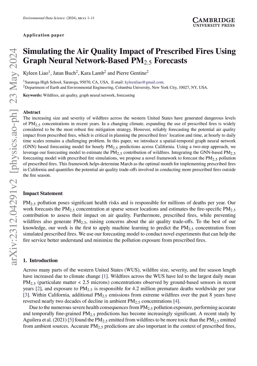The increasing size and severity of wildfires across the western United States have generated dangerous levels of PM concentrations in recent years. In a changing climate, expanding the use of prescribed fires is widely considered to be the most robust fire mitigation strategy. However, reliably forecasting the potential air quality impact from prescribed fires, which is critical in planning the prescribed fires' location and time, at hourly to daily time scales remains a challenging problem. In this paper, we introduce a spatial-temporal graph neural network (GNN) based forecasting model for hourly PM predictions across California. Using a two-step approach, we leverage our forecasting model to estimate the PM contribution of wildfires. Integrating the GNN-based PM forecasting model with prescribed fire simulations, we propose a novel framework to forecast the PM pollution of prescribed fires. This framework helps determine March as the optimal month for implementing prescribed fires in California and quantifies the potential air quality trade-offs involved in conducting more prescribed fires outside the fire season.