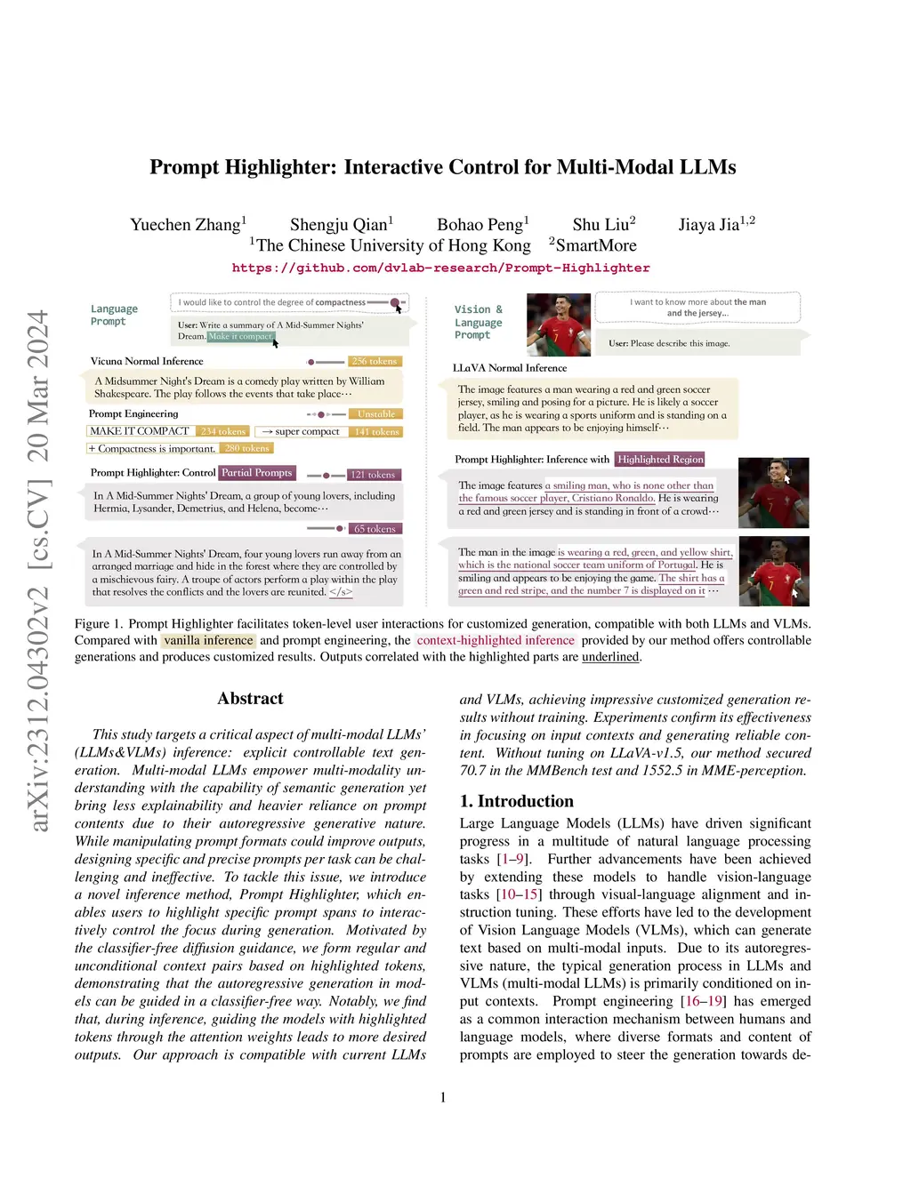 This study targets a critical aspect of multi-modal LLMs' (LLMs&VLMs) inference: explicit controllable text generation. Multi-modal LLMs empower multi-modality understanding with the capability of semantic generation yet bring less explainability and heavier reliance on prompt contents due to their autoregressive generative nature. While manipulating prompt formats could improve outputs, designing specific and precise prompts per task can be challenging and ineffective. To tackle this issue, we introduce a novel inference method, Prompt Highlighter, which enables users to highlight specific prompt spans to interactively control the focus during generation. Motivated by the classifier-free diffusion guidance, we form regular and unconditional context pairs based on highlighted tokens, demonstrating that the autoregressive generation in models can be guided in a classifier-free way. Notably, we find that, during inference, guiding the models with highlighted tokens through the attention weights leads to more desired outputs. Our approach is compatible with current LLMs and VLMs, achieving impressive customized generation results without training. Experiments confirm its effectiveness in focusing on input contexts and generating reliable content. Without tuning on LLaVA-v1.5, our method secured 70.7 in the MMBench test and 1552.5 in MME-perception. The code is available at: https://github.com/dvlab-research/Prompt-Highlighter/