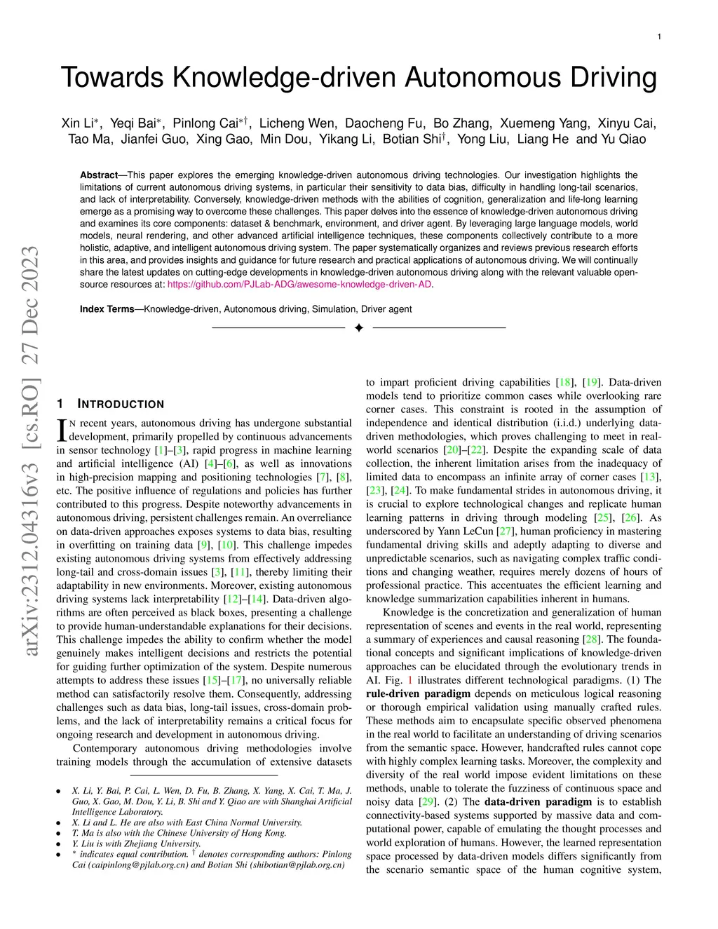 This paper explores the emerging knowledge-driven autonomous driving technologies. Our investigation highlights the limitations of current autonomous driving systems, in particular their sensitivity to data bias, difficulty in handling long-tail scenarios, and lack of interpretability. Conversely, knowledge-driven methods with the abilities of cognition, generalization and life-long learning emerge as a promising way to overcome these challenges. This paper delves into the essence of knowledge-driven autonomous driving and examines its core components: dataset \& benchmark, environment, and driver agent. By leveraging large language models, world models, neural rendering, and other advanced artificial intelligence techniques, these components collectively contribute to a more holistic, adaptive, and intelligent autonomous driving system. The paper systematically organizes and reviews previous research efforts in this area, and provides insights and guidance for future research and practical applications of autonomous driving. We will continually share the latest updates on cutting-edge developments in knowledge-driven autonomous driving along with the relevant valuable open-source resources at: \url{https://github.com/PJLab-ADG/awesome-knowledge-driven-AD}.