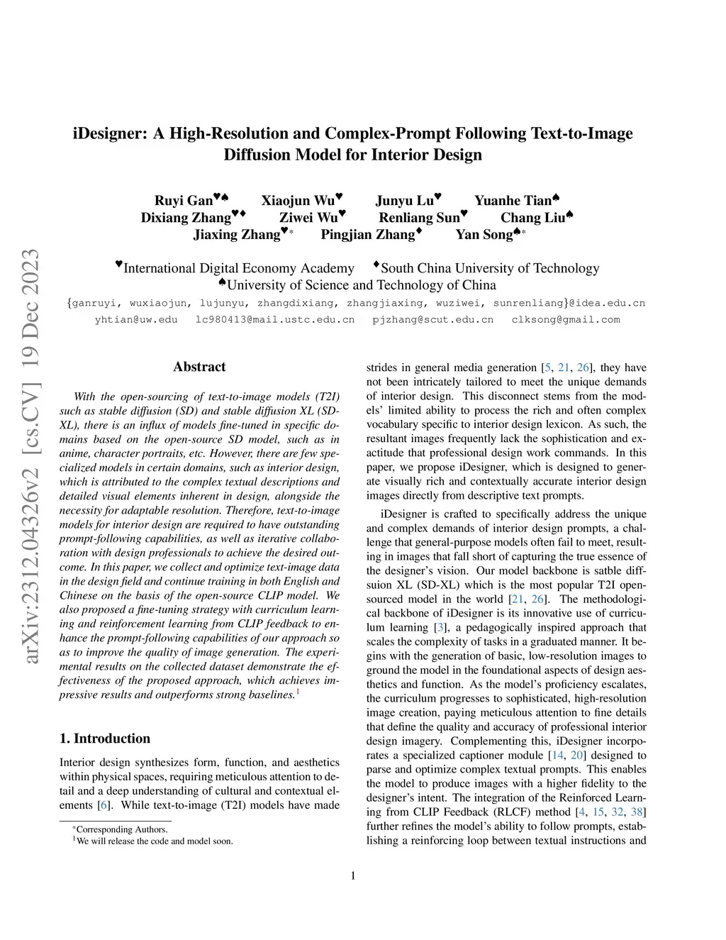 With the open-sourcing of text-to-image models (T2I) such as stable diffusion (SD) and stable diffusion XL (SD-XL), there is an influx of models fine-tuned in specific domains based on the open-source SD model, such as in anime, character portraits, etc. However, there are few specialized models in certain domains, such as interior design, which is attributed to the complex textual descriptions and detailed visual elements inherent in design, alongside the necessity for adaptable resolution. Therefore, text-to-image models for interior design are required to have outstanding prompt-following capabilities, as well as iterative collaboration with design professionals to achieve the desired outcome. In this paper, we collect and optimize text-image data in the design field and continue training in both English and Chinese on the basis of the open-source CLIP model. We also proposed a fine-tuning strategy with curriculum learning and reinforcement learning from CLIP feedback to enhance the prompt-following capabilities of our approach so as to improve the quality of image generation. The experimental results on the collected dataset demonstrate the effectiveness of the proposed approach, which achieves impressive results and outperforms strong baselines.