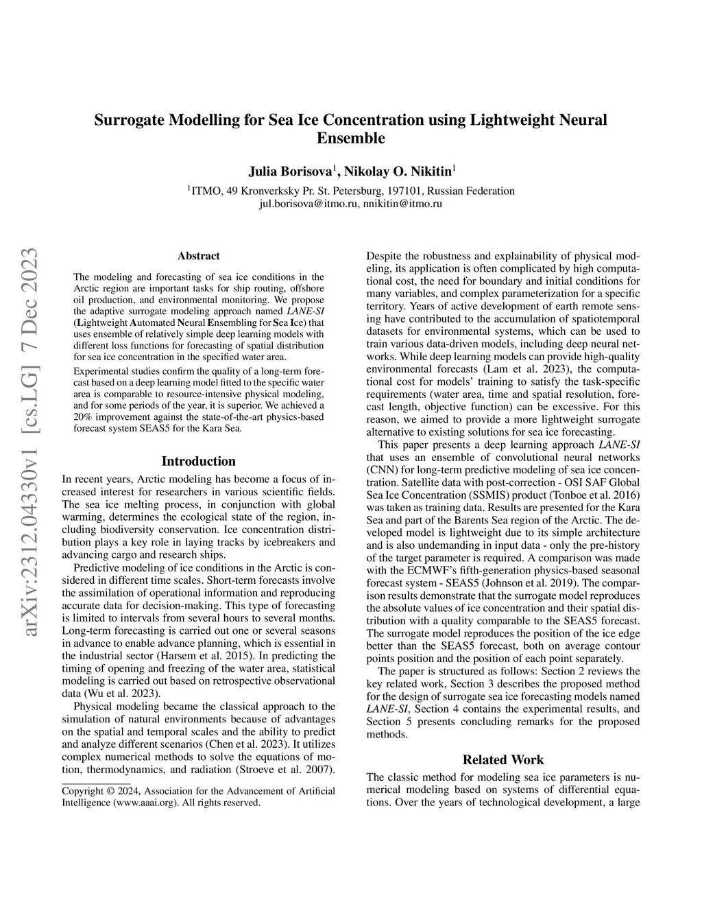 The modeling and forecasting of sea ice conditions in the Arctic region are important tasks for ship routing, offshore oil production, and environmental monitoring. We propose the adaptive surrogate modeling approach named LANE-SI (Lightweight Automated Neural Ensembling for Sea Ice) that uses ensemble of relatively simple deep learning models with different loss functions for forecasting of spatial distribution for sea ice concentration in the specified water area. Experimental studies confirm the quality of a long-term forecast based on a deep learning model fitted to the specific water area is comparable to resource-intensive physical modeling, and for some periods of the year, it is superior. We achieved a 20% improvement against the state-of-the-art physics-based forecast system SEAS5 for the Kara Sea.