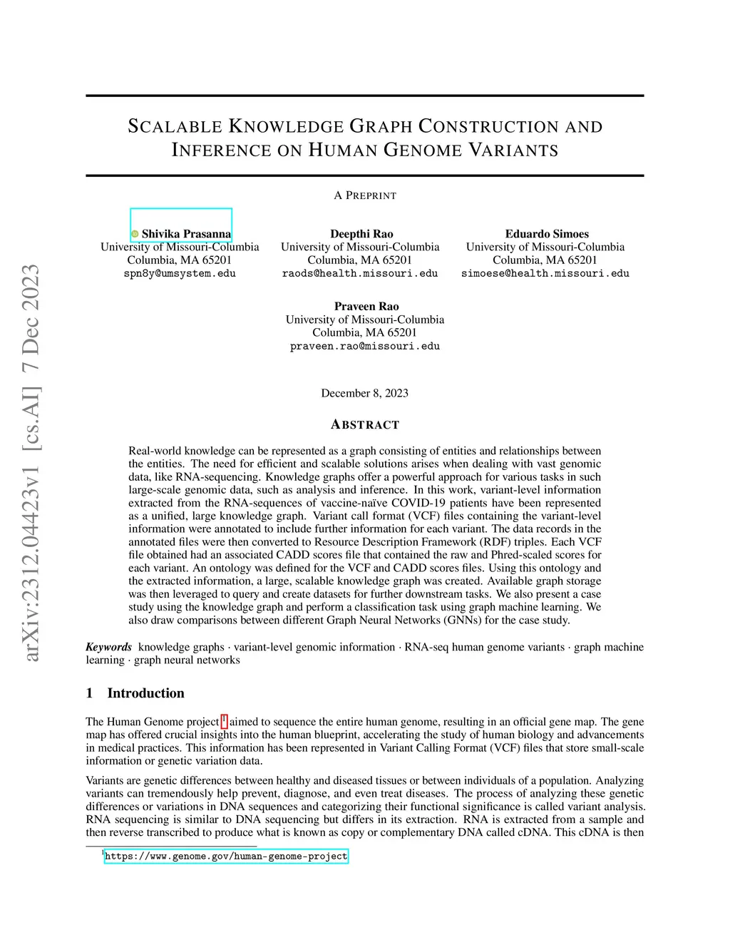 Real-world knowledge can be represented as a graph consisting of entities and relationships between the entities. The need for efficient and scalable solutions arises when dealing with vast genomic data, like RNA-sequencing. Knowledge graphs offer a powerful approach for various tasks in such large-scale genomic data, such as analysis and inference. In this work, variant-level information extracted from the RNA-sequences of vaccine-na\"ive COVID-19 patients have been represented as a unified, large knowledge graph. Variant call format (VCF) files containing the variant-level information were annotated to include further information for each variant. The data records in the annotated files were then converted to Resource Description Framework (RDF) triples. Each VCF file obtained had an associated CADD scores file that contained the raw and Phred-scaled scores for each variant. An ontology was defined for the VCF and CADD scores files. Using this ontology and the extracted information, a large, scalable knowledge graph was created. Available graph storage was then leveraged to query and create datasets for further downstream tasks. We also present a case study using the knowledge graph and perform a classification task using graph machine learning. We also draw comparisons between different Graph Neural Networks (GNNs) for the case study.