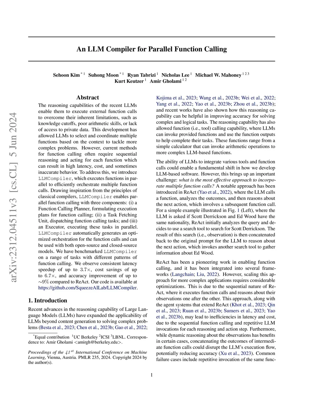 The reasoning capabilities of the recent LLMs enable them to execute external function calls to overcome their inherent limitations, such as knowledge cutoffs, poor arithmetic skills, or lack of access to private data. This development has allowed LLMs to select and coordinate multiple functions based on the context to tackle more complex problems. However, current methods for function calling often require sequential reasoning and acting for each function which can result in high latency, cost, and sometimes inaccurate behavior. To address this, we introduce LLMCompiler, which executes functions in parallel to efficiently orchestrate multiple function calls. Drawing inspiration from the principles of classical compilers, LLMCompiler enables parallel function calling with three components: (i) a Function Calling Planner, formulating execution plans for function calling; (ii) a Task Fetching Unit, dispatching function calling tasks; and (iii) an Executor, executing these tasks in parallel. LLMCompiler automatically generates an optimized orchestration for the function calls and can be used with both open-source and closed-source models. We have benchmarked LLMCompiler on a range of tasks with different patterns of function calling. We observe consistent latency speedup of up to 3.7x, cost savings of up to 6.7x, and accuracy improvement of up to ~9% compared to ReAct. Our code is available at https://github.com/SqueezeAILab/LLMCompiler.
