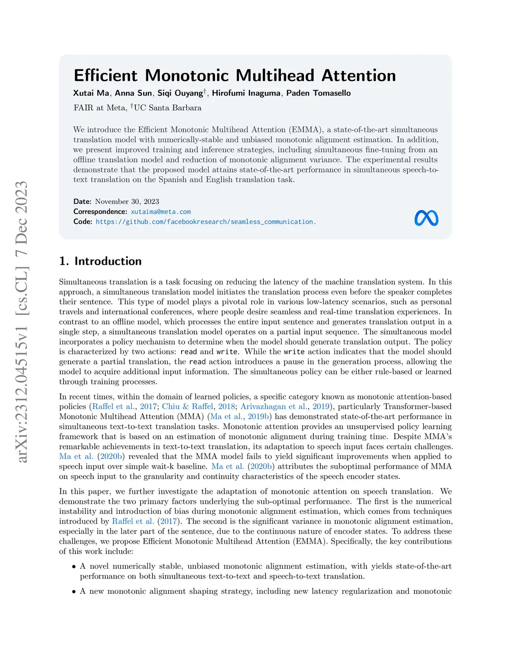We introduce the Efficient Monotonic Multihead Attention (EMMA), a state-of-the-art simultaneous translation model with numerically-stable and unbiased monotonic alignment estimation. In addition, we present improved training and inference strategies, including simultaneous fine-tuning from an offline translation model and reduction of monotonic alignment variance. The experimental results demonstrate that the proposed model attains state-of-the-art performance in simultaneous speech-to-text translation on the Spanish and English translation task.