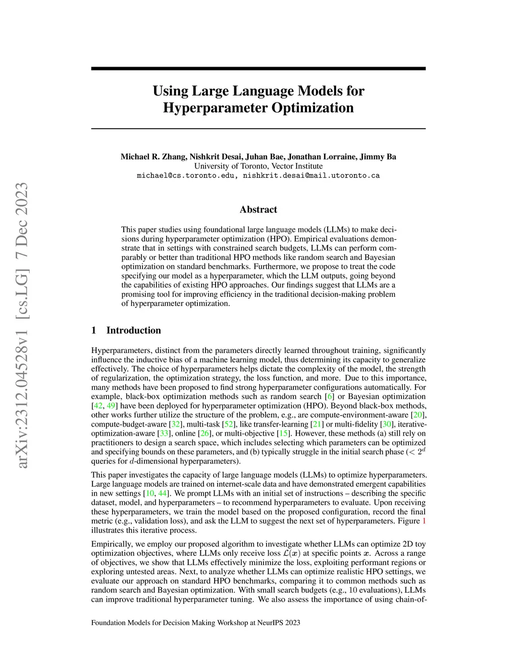 This paper studies using foundational large language models (LLMs) to make decisions during hyperparameter optimization (HPO). Empirical evaluations demonstrate that in settings with constrained search budgets, LLMs can perform comparably or better than traditional HPO methods like random search and Bayesian optimization on standard benchmarks. Furthermore, we propose to treat the code specifying our model as a hyperparameter, which the LLM outputs, going beyond the capabilities of existing HPO approaches. Our findings suggest that LLMs are a promising tool for improving efficiency in the traditional decision-making problem of hyperparameter optimization.