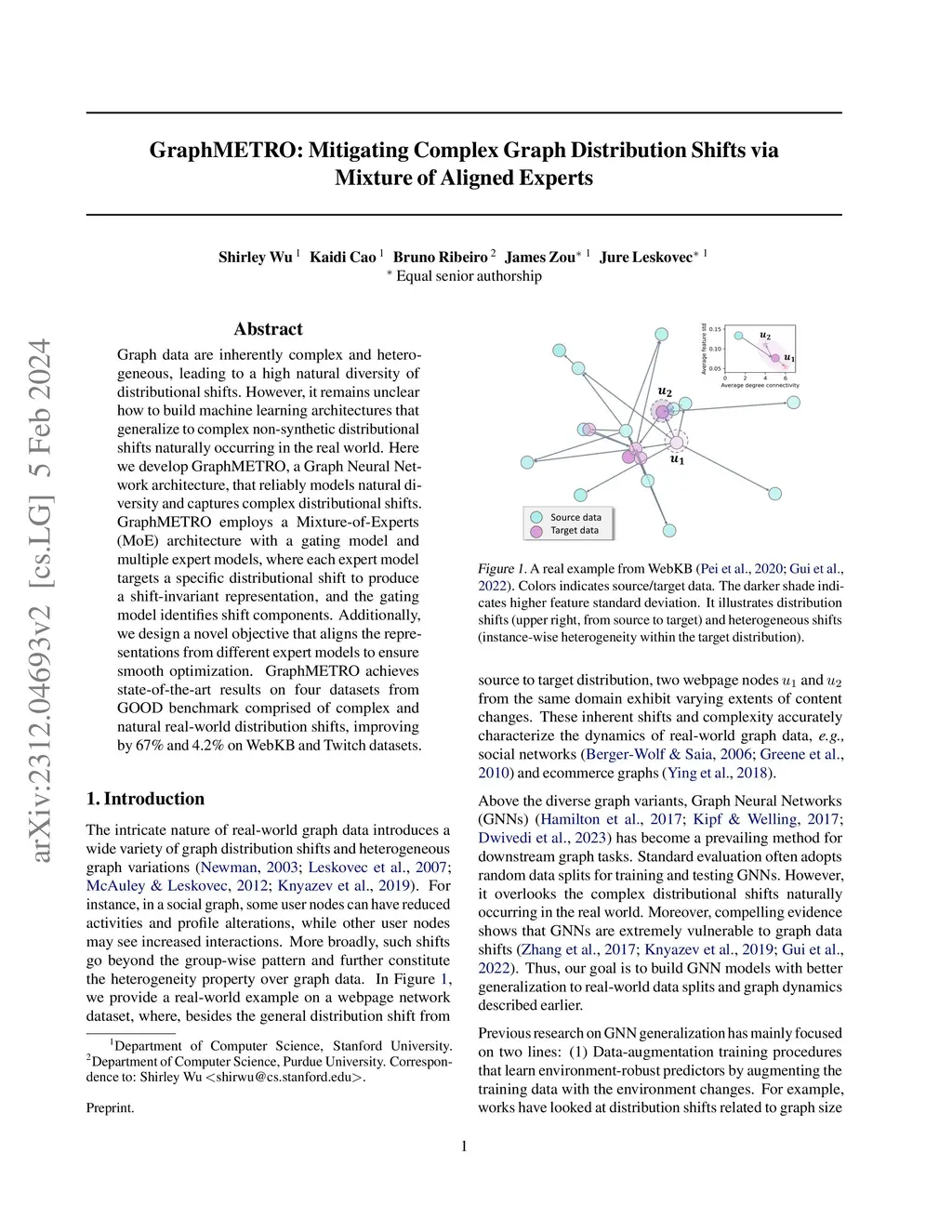 Graph data are inherently complex and heterogeneous, leading to a high natural diversity of distributional shifts. However, it remains unclear how to build machine learning architectures that generalize to complex non-synthetic distributional shifts naturally occurring in the real world. Here we develop GraphMETRO, a Graph Neural Network architecture, that reliably models natural diversity and captures complex distributional shifts. GraphMETRO employs a Mixture-of-Experts (MoE) architecture with a gating model and multiple expert models, where each expert model targets a specific distributional shift to produce a shift-invariant representation, and the gating model identifies shift components. Additionally, we design a novel objective that aligns the representations from different expert models to ensure smooth optimization. GraphMETRO achieves state-of-the-art results on four datasets from GOOD benchmark comprised of complex and natural real-world distribution shifts, improving by 67% and 4.2% on WebKB and Twitch datasets.
