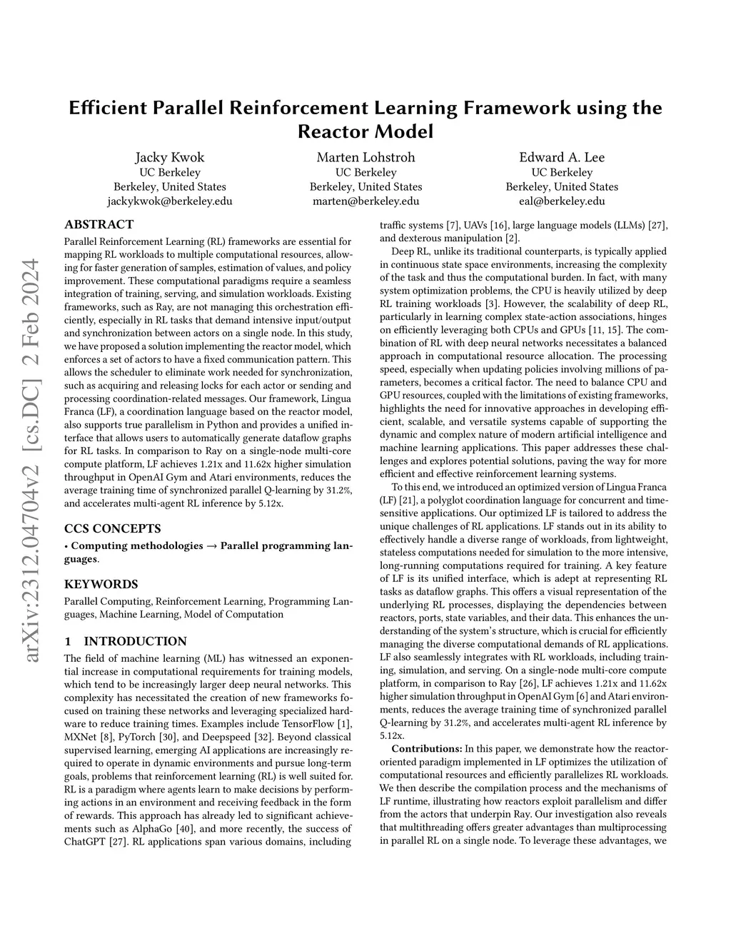 Parallel Reinforcement Learning (RL) frameworks are essential for mapping RL workloads to multiple computational resources, allowing for faster generation of samples, estimation of values, and policy improvement. These computational paradigms require a seamless integration of training, serving, and simulation workloads. Existing frameworks, such as Ray, are not managing this orchestration efficiently, especially in RL tasks that demand intensive input/output and synchronization between actors on a single node. In this study, we have proposed a solution implementing the reactor model, which enforces a set of actors to have a fixed communication pattern. This allows the scheduler to eliminate work needed for synchronization, such as acquiring and releasing locks for each actor or sending and processing coordination-related messages. Our framework, Lingua Franca (LF), a coordination language based on the reactor model, also supports true parallelism in Python and provides a unified interface that allows users to automatically generate dataflow graphs for RL tasks. In comparison to Ray on a single-node multi-core compute platform, LF achieves 1.21x and 11.62x higher simulation throughput in OpenAI Gym and Atari environments, reduces the average training time of synchronized parallel Q-learning by 31.2%, and accelerates multi-agent RL inference by 5.12x.