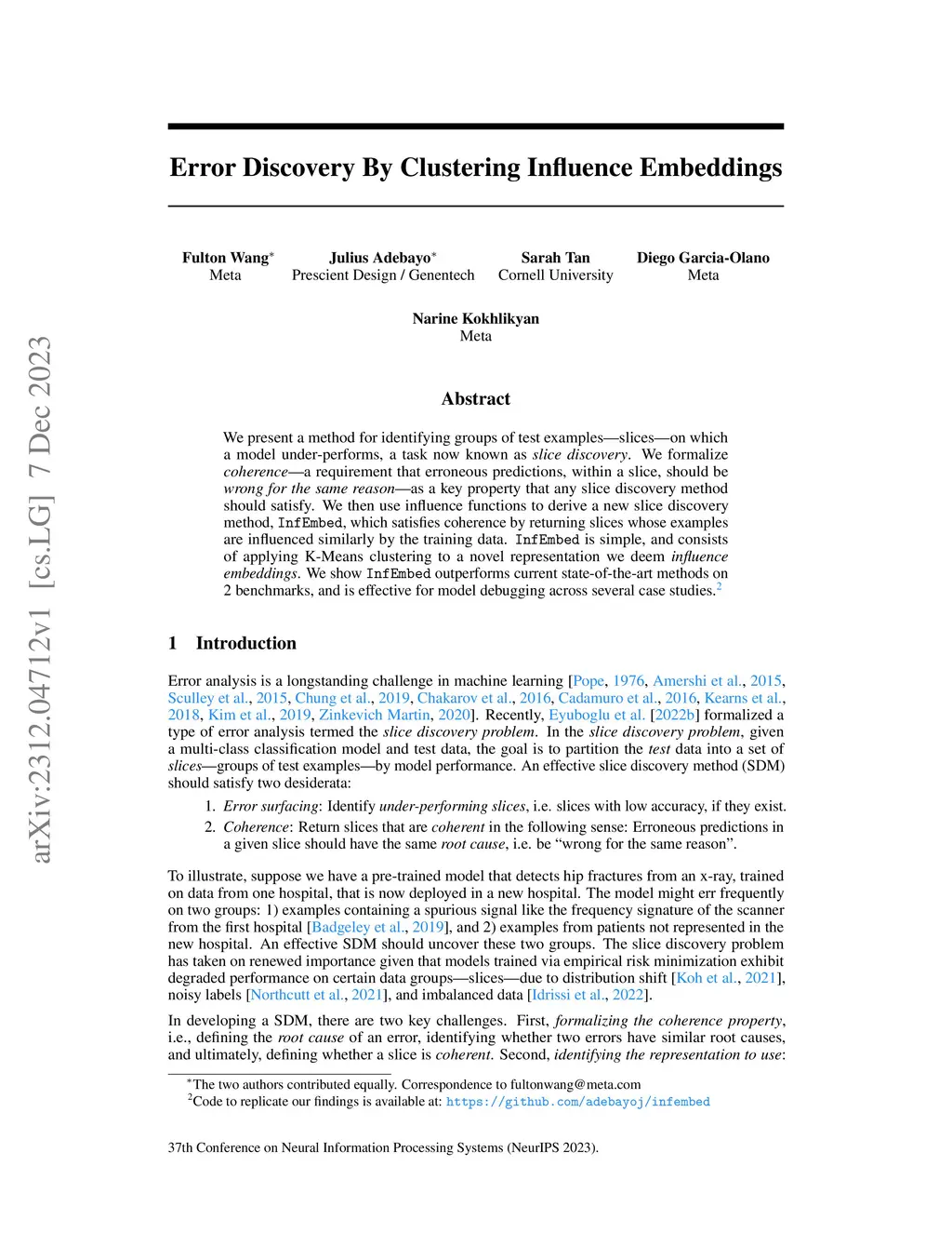 We present a method for identifying groups of test examples -- slices -- on which a model under-performs, a task now known as slice discovery. We formalize coherence -- a requirement that erroneous predictions, within a slice, should be wrong for the same reason -- as a key property that any slice discovery method should satisfy. We then use influence functions to derive a new slice discovery method, InfEmbed, which satisfies coherence by returning slices whose examples are influenced similarly by the training data. InfEmbed is simple, and consists of applying K-Means clustering to a novel representation we deem influence embeddings. We show InfEmbed outperforms current state-of-the-art methods on 2 benchmarks, and is effective for model debugging across several case studies.