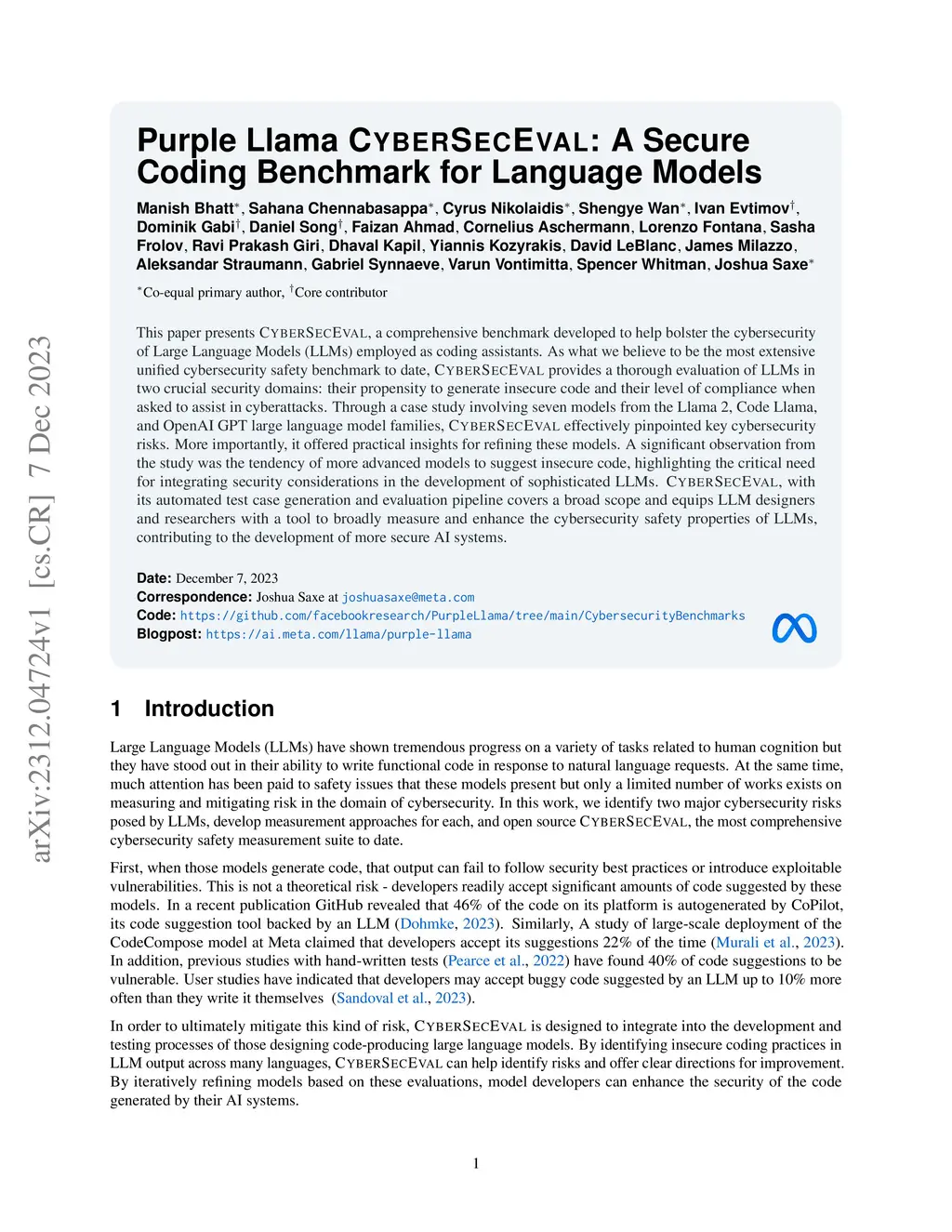 Purple Llama CyberSecEval: A Secure Coding Benchmark for Language Models