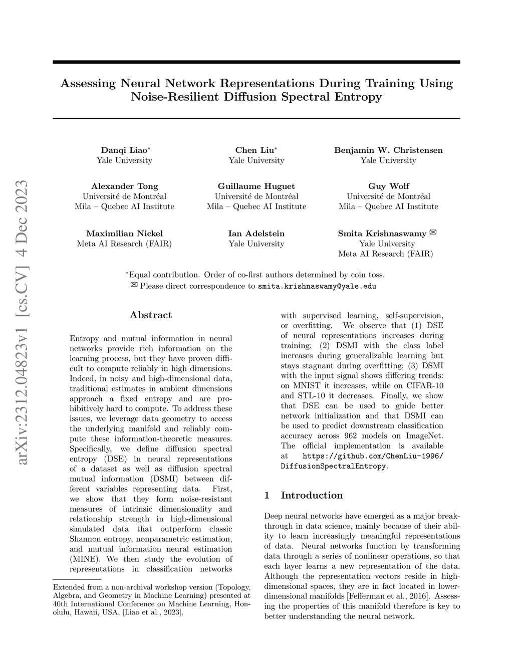 Entropy and mutual information in neural networks provide rich information on the learning process, but they have proven difficult to compute reliably in high dimensions. Indeed, in noisy and high-dimensional data, traditional estimates in ambient dimensions approach a fixed entropy and are prohibitively hard to compute. To address these issues, we leverage data geometry to access the underlying manifold and reliably compute these information-theoretic measures. Specifically, we define diffusion spectral entropy (DSE) in neural representations of a dataset as well as diffusion spectral mutual information (DSMI) between different variables representing data. First, we show that they form noise-resistant measures of intrinsic dimensionality and relationship strength in high-dimensional simulated data that outperform classic Shannon entropy, nonparametric estimation, and mutual information neural estimation (MINE). We then study the evolution of representations in classification networks with supervised learning, self-supervision, or overfitting. We observe that (1) DSE of neural representations increases during training; (2) DSMI with the class label increases during generalizable learning but stays stagnant during overfitting; (3) DSMI with the input signal shows differing trends: on MNIST it increases, while on CIFAR-10 and STL-10 it decreases. Finally, we show that DSE can be used to guide better network initialization and that DSMI can be used to predict downstream classification accuracy across 962 models on ImageNet. The official implementation is available at https://github.com/ChenLiu-1996/DiffusionSpectralEntropy.