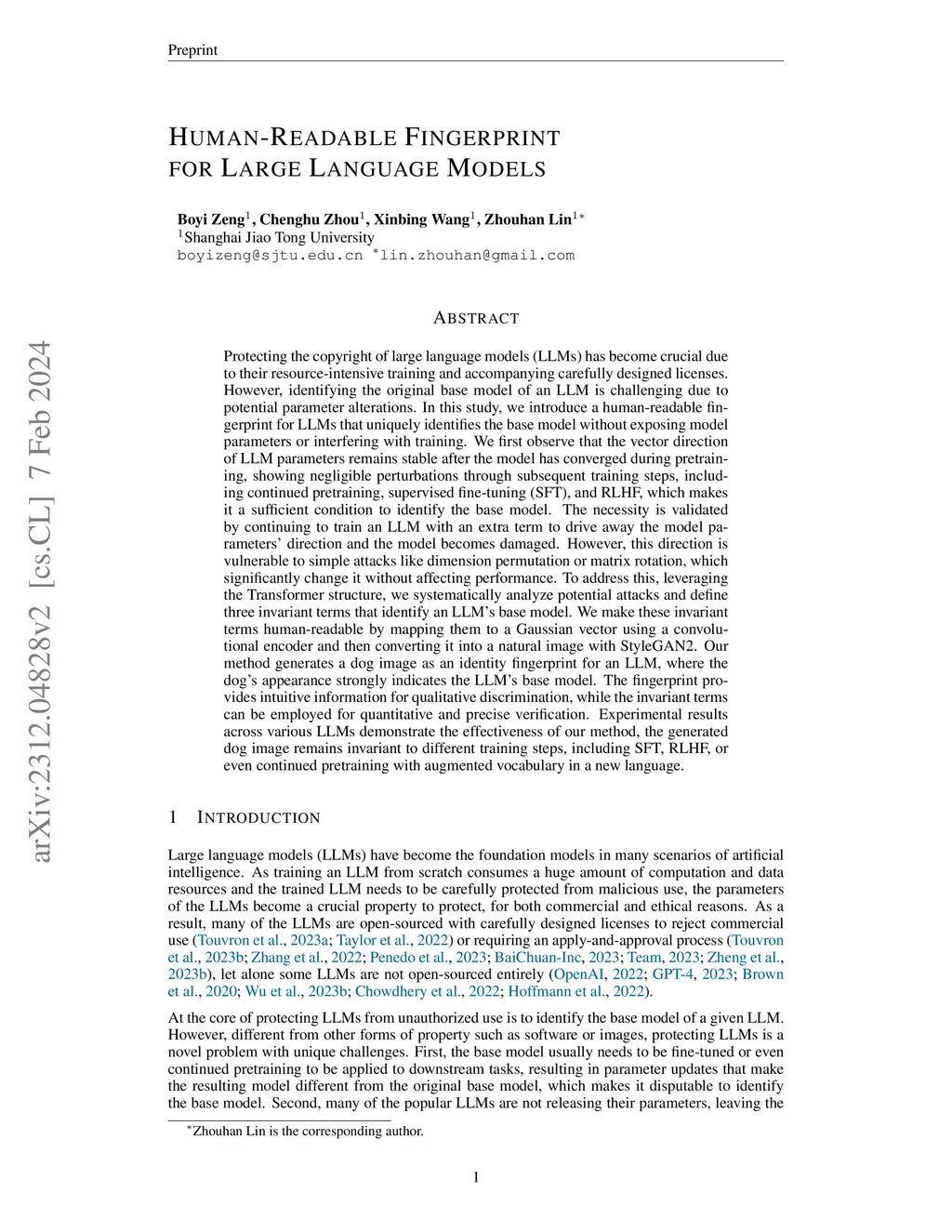 Protecting the copyright of large language models (LLMs) has become crucial due to their resource-intensive training and accompanying carefully designed licenses. However, identifying the original base model of an LLM is challenging due to potential parameter alterations. In this study, we introduce HuRef, a human-readable fingerprint for LLMs that uniquely identifies the base model without interfering with training or exposing model parameters to the public. We first observe that the vector direction of LLM parameters remains stable after the model has converged during pretraining, with negligible perturbations through subsequent training steps, including continued pretraining, supervised fine-tuning, and RLHF, which makes it a sufficient condition to identify the base model. The necessity is validated by continuing to train an LLM with an extra term to drive away the model parameters' direction and the model becomes damaged. However, this direction is vulnerable to simple attacks like dimension permutation or matrix rotation, which significantly change it without affecting performance. To address this, leveraging the Transformer structure, we systematically analyze potential attacks and define three invariant terms that identify an LLM's base model. Due to the potential risk of information leakage, we cannot publish invariant terms directly. Instead, we map them to a Gaussian vector using an encoder, then convert it into a natural image using StyleGAN2, and finally publish the image. In our black-box setting, all fingerprinting steps are internally conducted by the LLMs owners. To ensure the published fingerprints are honestly generated, we introduced Zero-Knowledge Proof (ZKP). Experimental results across various LLMs demonstrate the effectiveness of our method. The code is available atthis https URL.