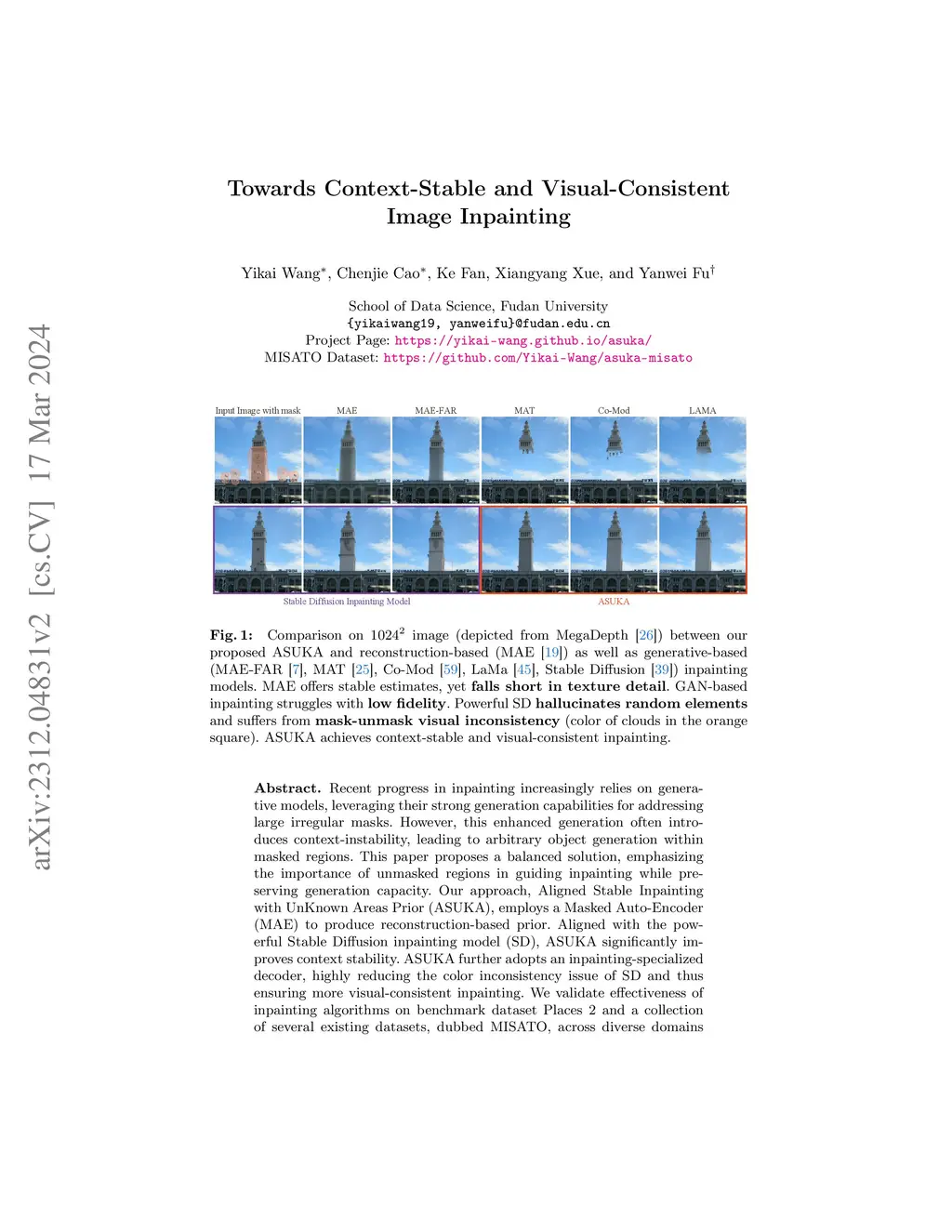 Recent advances in image inpainting increasingly use generative models to handle large irregular masks. However, these models can create unrealistic inpainted images due to two main issues: (1) Unwanted object insertion: Even with unmasked areas as context, generative models may still generate arbitrary objects in the masked region that don't align with the rest of the image. (2) Color inconsistency: Inpainted regions often have color shifts that causes a smeared appearance, reducing image quality. Retraining the generative model could help solve these issues, but it's costly since state-of-the-art latent-based diffusion and rectified flow models require a three-stage training process: training a VAE, training a generative U-Net or transformer, and fine-tuning for inpainting. Instead, this paper proposes a post-processing approach, dubbed as ASUKA (Aligned Stable inpainting with UnKnown Areas prior), to improve inpainting models. To address unwanted object insertion, we leverage a Masked Auto-Encoder (MAE) for reconstruction-based priors. This mitigates object hallucination while maintaining the model's generation capabilities. To address color inconsistency, we propose a specialized VAE decoder that treats latent-to-image decoding as a local harmonization task, significantly reducing color shifts for color-consistent inpainting. We validate ASUKA on SD 1.5 and FLUX inpainting variants with Places2 and MISATO, our proposed diverse collection of datasets. Results show that ASUKA mitigates object hallucination and improves color consistency over standard diffusion and rectified flow models and other inpainting methods.