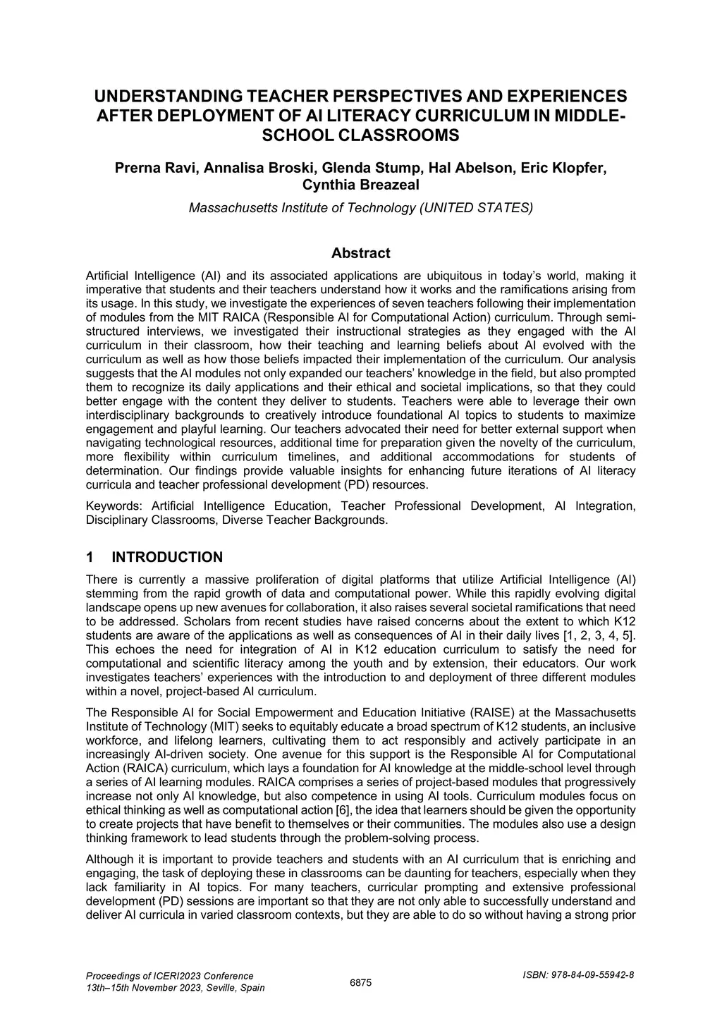 Artificial Intelligence (AI) and its associated applications are ubiquitous in today's world, making it imperative that students and their teachers understand how it works and the ramifications arising from its usage. In this study, we investigate the experiences of seven teachers following their implementation of modules from the MIT RAICA (Responsible AI for Computational Action) curriculum. Through semi-structured interviews, we investigated their instructional strategies as they engaged with the AI curriculum in their classroom, how their teaching and learning beliefs about AI evolved with the curriculum as well as how those beliefs impacted their implementation of the curriculum. Our analysis suggests that the AI modules not only expanded our teachers' knowledge in the field, but also prompted them to recognize its daily applications and their ethical and societal implications, so that they could better engage with the content they deliver to students. Teachers were able to leverage their own interdisciplinary backgrounds to creatively introduce foundational AI topics to students to maximize engagement and playful learning. Our teachers advocated their need for better external support when navigating technological resources, additional time for preparation given the novelty of the curriculum, more flexibility within curriculum timelines, and additional accommodations for students of determination. Our findings provide valuable insights for enhancing future iterations of AI literacy curricula and teacher professional development (PD) resources.