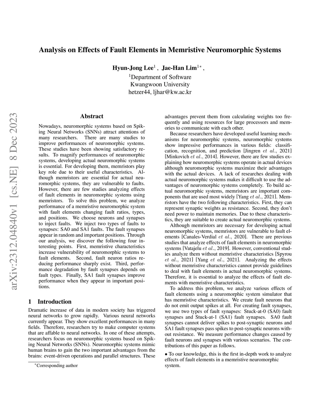 Nowadays, neuromorphic systems based on Spiking Neural Networks (SNNs) attract attentions of many researchers. There are many studies to improve performances of neuromorphic systems. These studies have been showing satisfactory results. To magnify performances of neuromorphic systems, developing actual neuromorphic systems is essential. For developing them, memristors play key role due to their useful characteristics. Although memristors are essential for actual neuromorphic systems, they are vulnerable to faults. However, there are few studies analyzing effects of fault elements in neuromorphic systems using memristors. To solve this problem, we analyze performance of a memristive neuromorphic system with fault elements changing fault ratios, types, and positions. We choose neurons and synapses to inject faults. We inject two types of faults to synapses: SA0 and SA1 faults. The fault synapses appear in random and important positions. Through our analysis, we discover the following four interesting points. First, memristive characteristics increase vulnerability of neuromorphic systems to fault elements. Second, fault neuron ratios reducing performance sharply exist. Third, performance degradation by fault synapses depends on fault types. Finally, SA1 fault synapses improve performance when they appear in important positions.