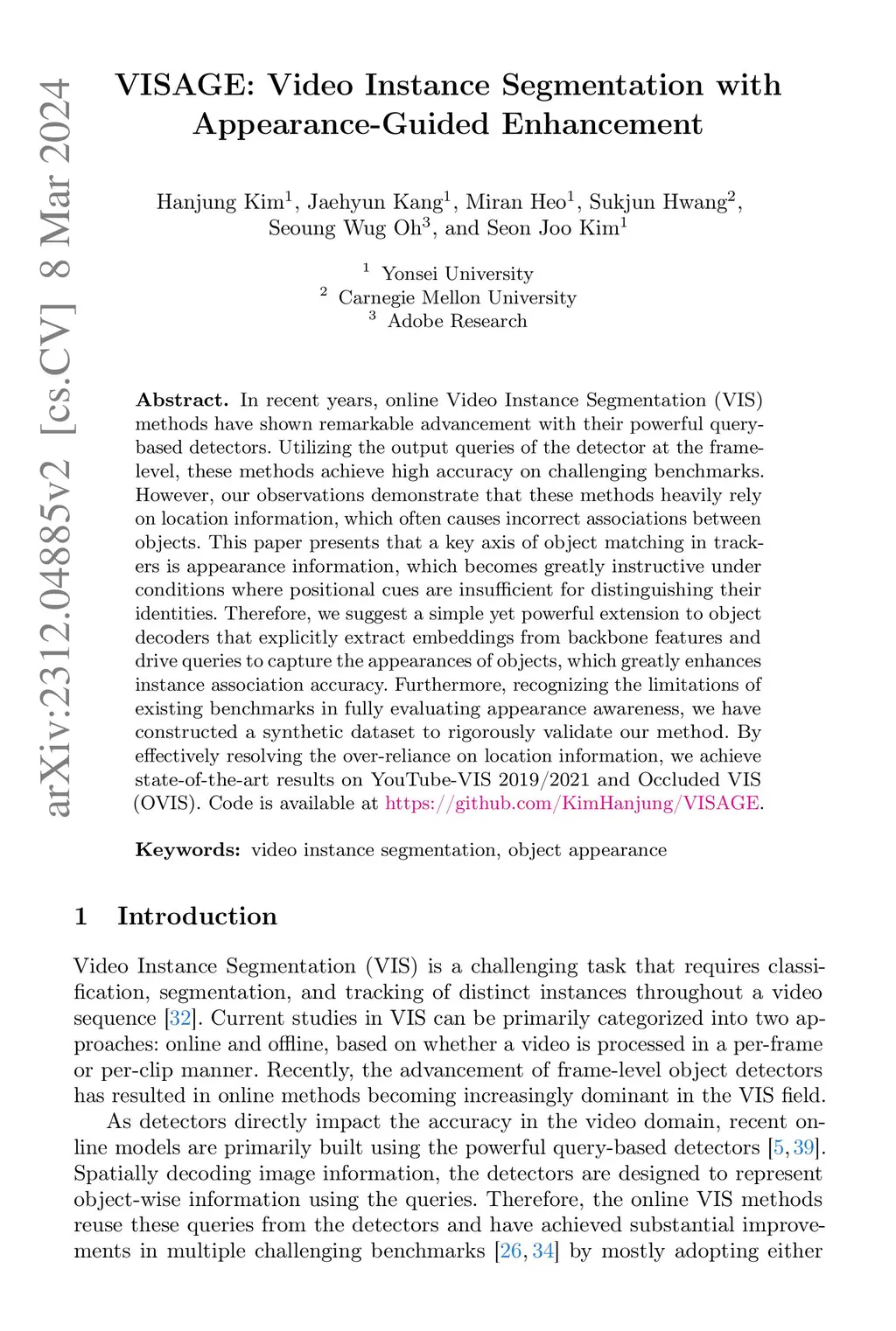 VISAGE: Video Instance Segmentation with Appearance-Guided Enhancement