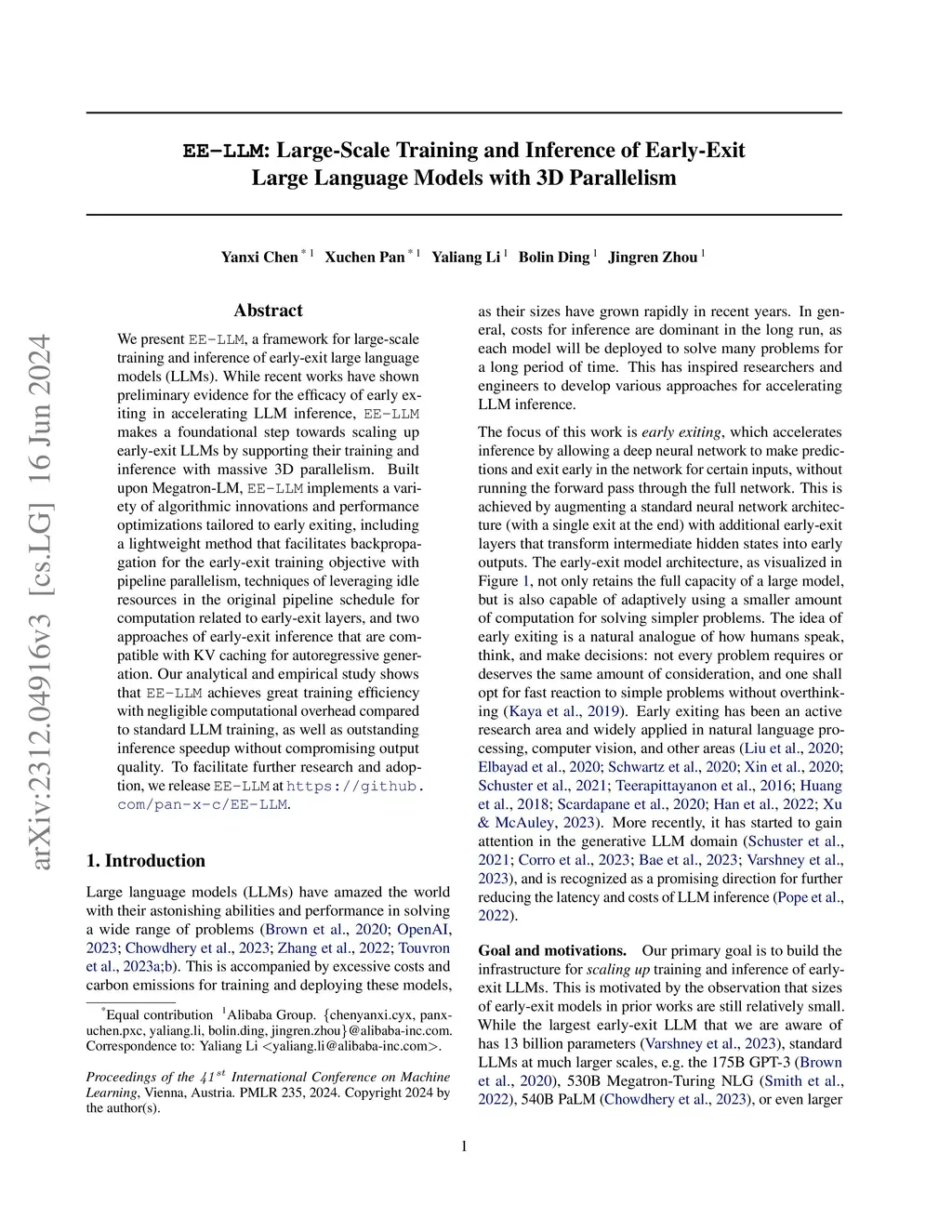 We present EE-LLM, a framework for large-scale training and inference of early-exit large language models (LLMs). While recent works have shown preliminary evidence for the efficacy of early exiting in accelerating LLM inference, EE-LLM makes a foundational step towards scaling up early-exit LLMs by supporting their training and inference with massive 3D parallelism. Built upon Megatron-LM, EE-LLM implements a variety of algorithmic innovations and performance optimizations tailored to early exiting, including a lightweight method that facilitates backpropagation for the early-exit training objective with pipeline parallelism, techniques of leveraging idle resources in the original pipeline schedule for computation related to early-exit layers, and two approaches of early-exit inference that are compatible with KV caching for autoregressive generation. Our analytical and empirical study shows that EE-LLM achieves great training efficiency with negligible computational overhead compared to standard LLM training, as well as outstanding inference speedup without compromising output quality. To facilitate further research and adoption, we release EE-LLM at https://github.com/pan-x-c/EE-LLM.