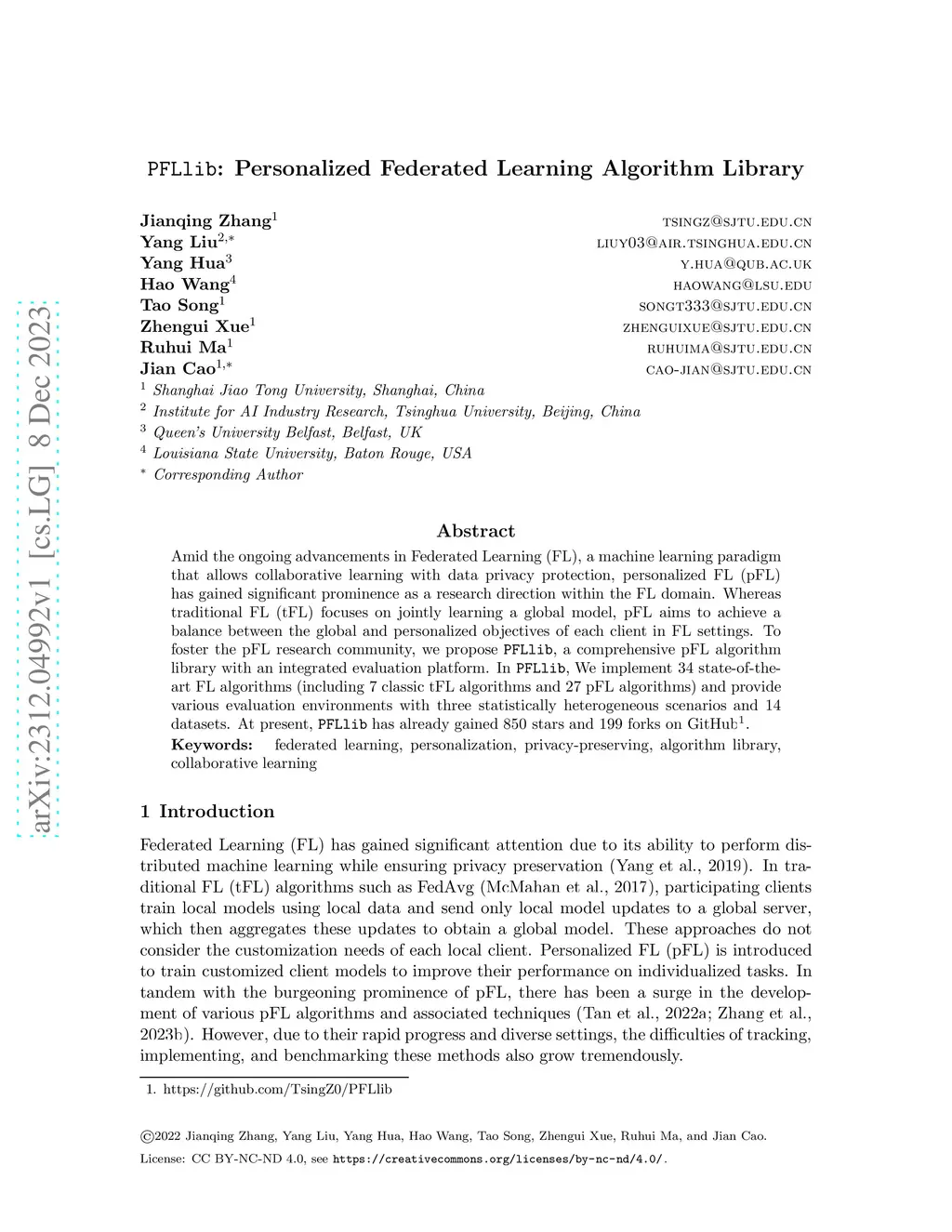 Amid the ongoing advancements in Federated Learning (FL), a machine learning paradigm that allows collaborative learning with data privacy protection, personalized FL (pFL)has gained significant prominence as a research direction within the FL domain. Whereas traditional FL (tFL) focuses on jointly learning a global model, pFL aims to balance each client's global and personalized goals in FL settings. To foster the pFL research community, we started and built PFLlib, a comprehensive pFL library with an integrated benchmark platform. In PFLlib, we implemented 37 state-of-the-art FL algorithms (8 tFL algorithms and 29 pFL algorithms) and provided various evaluation environments with three statistically heterogeneous scenarios and 24 datasets. At present, PFLlib has gained more than 1600 stars and 300 forks on GitHub.