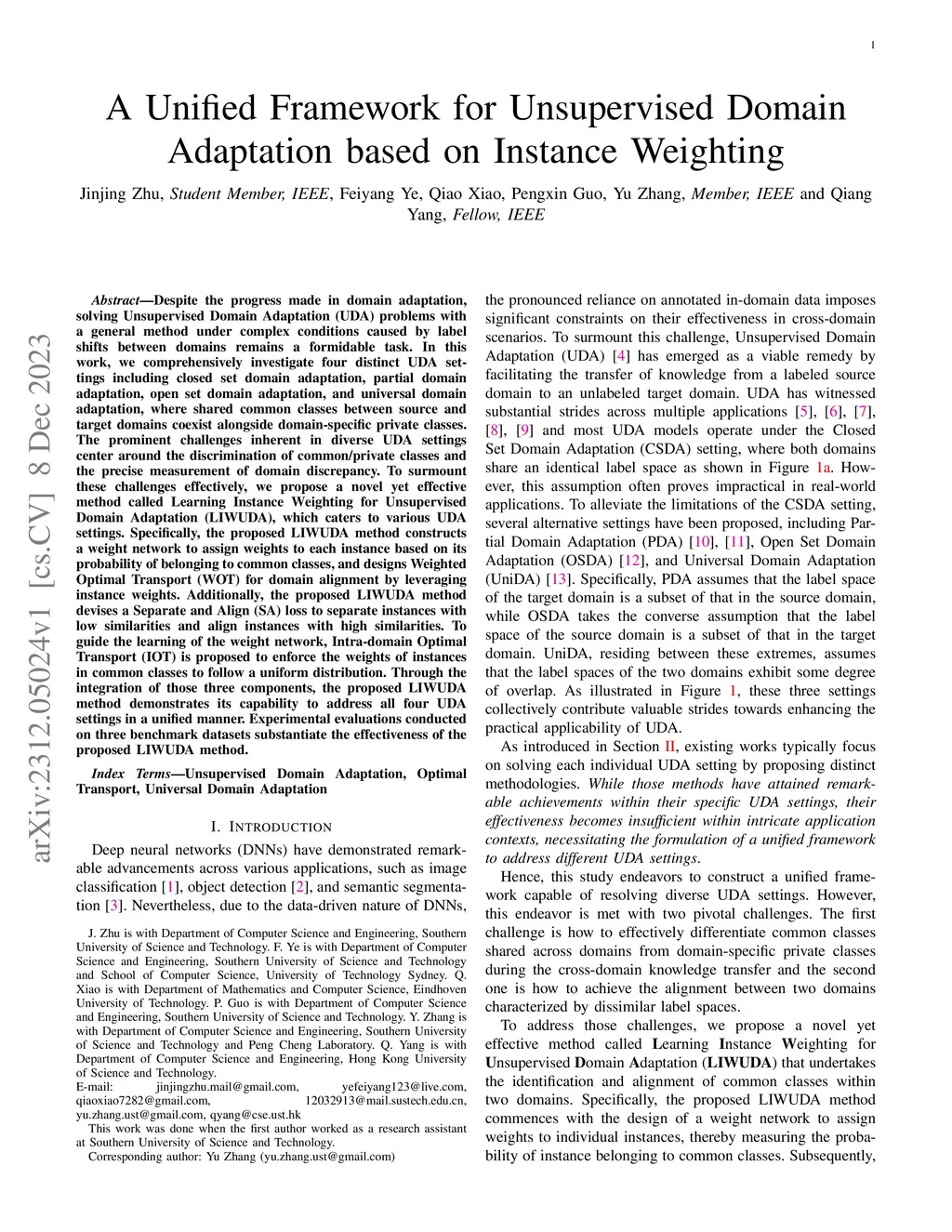 Despite the progress made in domain adaptation, solving Unsupervised Domain Adaptation (UDA) problems with a general method under complex conditions caused by label shifts between domains remains a formidable task. In this work, we comprehensively investigate four distinct UDA settings including closed set domain adaptation, partial domain adaptation, open set domain adaptation, and universal domain adaptation, where shared common classes between source and target domains coexist alongside domain-specific private classes. The prominent challenges inherent in diverse UDA settings center around the discrimination of common/private classes and the precise measurement of domain discrepancy. To surmount these challenges effectively, we propose a novel yet effective method called Learning Instance Weighting for Unsupervised Domain Adaptation (LIWUDA), which caters to various UDA settings. Specifically, the proposed LIWUDA method constructs a weight network to assign weights to each instance based on its probability of belonging to common classes, and designs Weighted Optimal Transport (WOT) for domain alignment by leveraging instance weights. Additionally, the proposed LIWUDA method devises a Separate and Align (SA) loss to separate instances with low similarities and align instances with high similarities. To guide the learning of the weight network, Intra-domain Optimal Transport (IOT) is proposed to enforce the weights of instances in common classes to follow a uniform distribution. Through the integration of those three components, the proposed LIWUDA method demonstrates its capability to address all four UDA settings in a unified manner. Experimental evaluations conducted on three benchmark datasets substantiate the effectiveness of the proposed LIWUDA method.