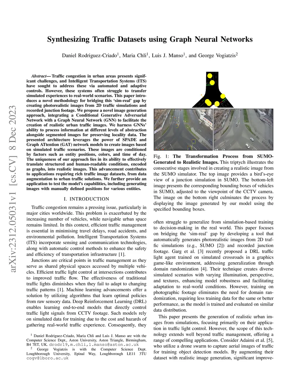 Traffic congestion in urban areas presents significant challenges, and Intelligent Transportation Systems (ITS) have sought to address these via automated and adaptive controls. However, these systems often struggle to transfer simulated experiences to real-world scenarios. This paper introduces a novel methodology for bridging this `sim-real' gap by creating photorealistic images from 2D traffic simulations and recorded junction footage. We propose a novel image generation approach, integrating a Conditional Generative Adversarial Network with a Graph Neural Network (GNN) to facilitate the creation of realistic urban traffic images. We harness GNNs' ability to process information at different levels of abstraction alongside segmented images for preserving locality data. The presented architecture leverages the power of SPADE and Graph ATtention (GAT) network models to create images based on simulated traffic scenarios. These images are conditioned by factors such as entity positions, colors, and time of day. The uniqueness of our approach lies in its ability to effectively translate structured and human-readable conditions, encoded as graphs, into realistic images. This advancement contributes to applications requiring rich traffic image datasets, from data augmentation to urban traffic solutions. We further provide an application to test the model's capabilities, including generating images with manually defined positions for various entities.