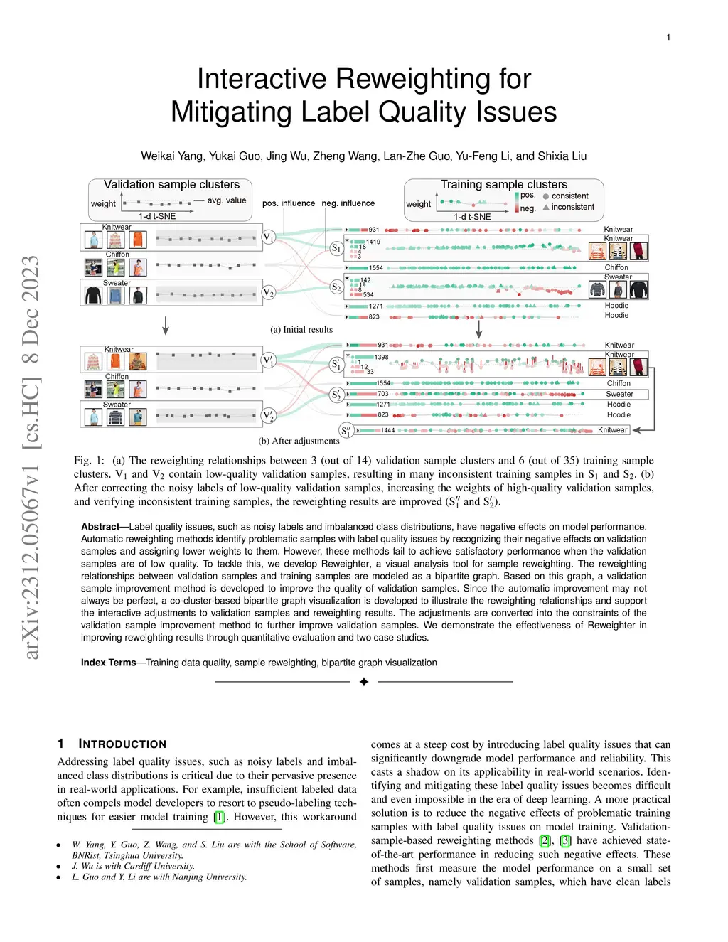 Label quality issues, such as noisy labels and imbalanced class distributions, have negative effects on model performance. Automatic reweighting methods identify problematic samples with label quality issues by recognizing their negative effects on validation samples and assigning lower weights to them. However, these methods fail to achieve satisfactory performance when the validation samples are of low quality. To tackle this, we develop Reweighter, a visual analysis tool for sample reweighting. The reweighting relationships between validation samples and training samples are modeled as a bipartite graph. Based on this graph, a validation sample improvement method is developed to improve the quality of validation samples. Since the automatic improvement may not always be perfect, a co-cluster-based bipartite graph visualization is developed to illustrate the reweighting relationships and support the interactive adjustments to validation samples and reweighting results. The adjustments are converted into the constraints of the validation sample improvement method to further improve validation samples. We demonstrate the effectiveness of Reweighter in improving reweighting results through quantitative evaluation and two case studies.
