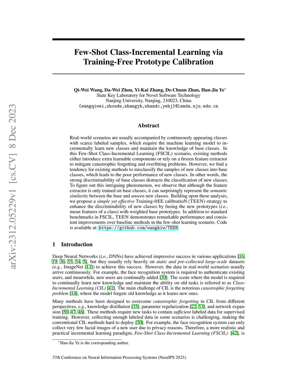 Real-world scenarios are usually accompanied by continuously appearing classes with scare labeled samples, which require the machine learning model to incrementally learn new classes and maintain the knowledge of base classes. In this Few-Shot Class-Incremental Learning (FSCIL) scenario, existing methods either introduce extra learnable components or rely on a frozen feature extractor to mitigate catastrophic forgetting and overfitting problems. However, we find a tendency for existing methods to misclassify the samples of new classes into base classes, which leads to the poor performance of new classes. In other words, the strong discriminability of base classes distracts the classification of new classes. To figure out this intriguing phenomenon, we observe that although the feature extractor is only trained on base classes, it can surprisingly represent the semantic similarity between the base and unseen new classes. Building upon these analyses, we propose a simple yet effective Training-frEE calibratioN (TEEN) strategy to enhance the discriminability of new classes by fusing the new prototypes (i.e., mean features of a class) with weighted base prototypes. In addition to standard benchmarks in FSCIL, TEEN demonstrates remarkable performance and consistent improvements over baseline methods in the few-shot learning scenario. Code is available at: https://github.com/wangkiw/TEEN