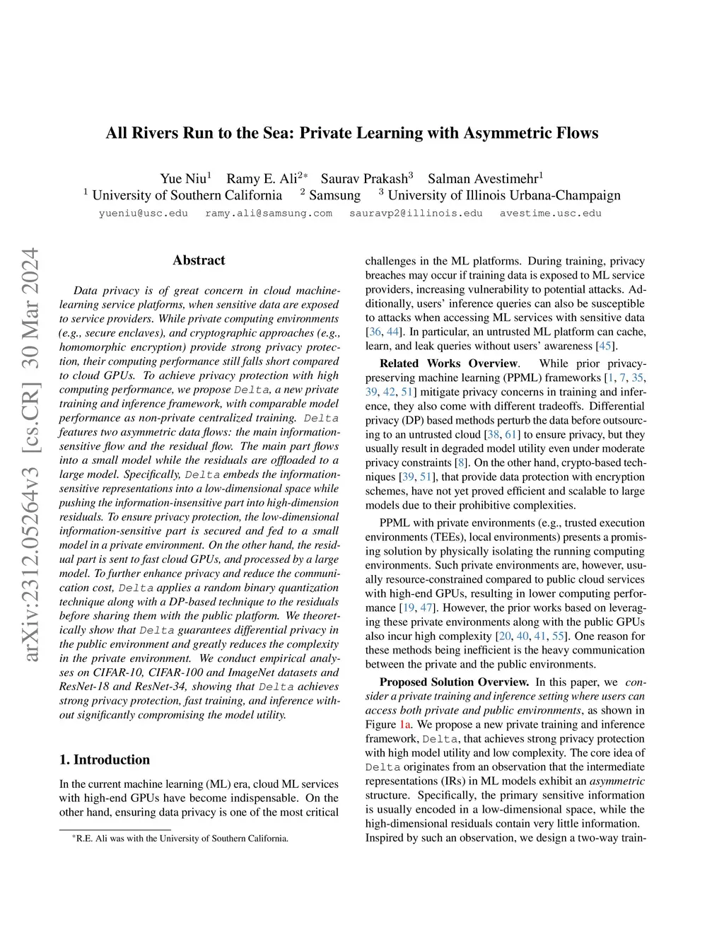 Data privacy is of great concern in cloud machine-learning service platforms, when sensitive data are exposed to service providers. While private computing environments (e.g., secure enclaves), and cryptographic approaches (e.g., homomorphic encryption) provide strong privacy protection, their computing performance still falls short compared to cloud GPUs. To achieve privacy protection with high computing performance, we propose Delta, a new private training and inference framework, with comparable model performance as non-private centralized training. Delta features two asymmetric data flows: the main information-sensitive flow and the residual flow. The main part flows into a small model while the residuals are offloaded to a large model. Specifically, Delta embeds the information-sensitive representations into a low-dimensional space while pushing the information-insensitive part into high-dimension residuals. To ensure privacy protection, the low-dimensional information-sensitive part is secured and fed to a small model in a private environment. On the other hand, the residual part is sent to fast cloud GPUs, and processed by a large model. To further enhance privacy and reduce the communication cost, Delta applies a random binary quantization technique along with a DP-based technique to the residuals before sharing them with the public platform. We theoretically show that Delta guarantees differential privacy in the public environment and greatly reduces the complexity in the private environment. We conduct empirical analyses on CIFAR-10, CIFAR-100 and ImageNet datasets and ResNet-18 and ResNet-34, showing that Delta achieves strong privacy protection, fast training, and inference without significantly compromising the model utility.
