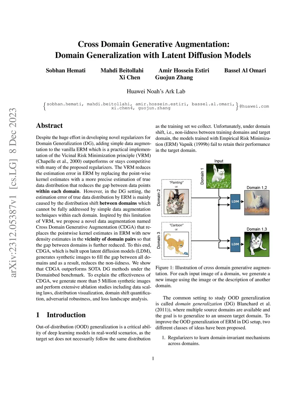 Despite the huge effort in developing novel regularizers for Domain Generalization (DG), adding simple data augmentation to the vanilla ERM which is a practical implementation of the Vicinal Risk Minimization principle (VRM) \citep{chapelle2000vicinal} outperforms or stays competitive with many of the proposed regularizers. The VRM reduces the estimation error in ERM by replacing the point-wise kernel estimates with a more precise estimation of true data distribution that reduces the gap between data points \textbf{within each domain}. However, in the DG setting, the estimation error of true data distribution by ERM is mainly caused by the distribution shift \textbf{between domains} which cannot be fully addressed by simple data augmentation techniques within each domain. Inspired by this limitation of VRM, we propose a novel data augmentation named Cross Domain Generative Augmentation (CDGA) that replaces the pointwise kernel estimates in ERM with new density estimates in the \textbf{vicinity of domain pairs} so that the gap between domains is further reduced. To this end, CDGA, which is built upon latent diffusion models (LDM), generates synthetic images to fill the gap between all domains and as a result, reduces the non-iidness. We show that CDGA outperforms SOTA DG methods under the Domainbed benchmark. To explain the effectiveness of CDGA, we generate more than 5 Million synthetic images and perform extensive ablation studies including data scaling laws, distribution visualization, domain shift quantification, adversarial robustness, and loss landscape analysis.