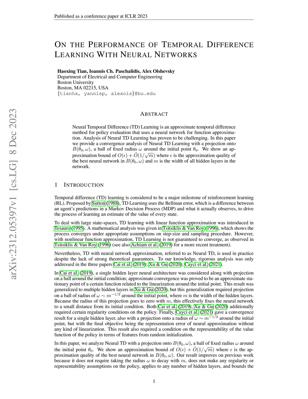 Neural Temporal Difference (TD) Learning is an approximate temporal difference method for policy evaluation that uses a neural network for function approximation. Analysis of Neural TD Learning has proven to be challenging. In this paper we provide a convergence analysis of Neural TD Learning with a projection onto , a ball of fixed radius around the initial point . We show an approximation bound of where is the approximation quality of the best neural network in and is the width of all hidden layers in the network.