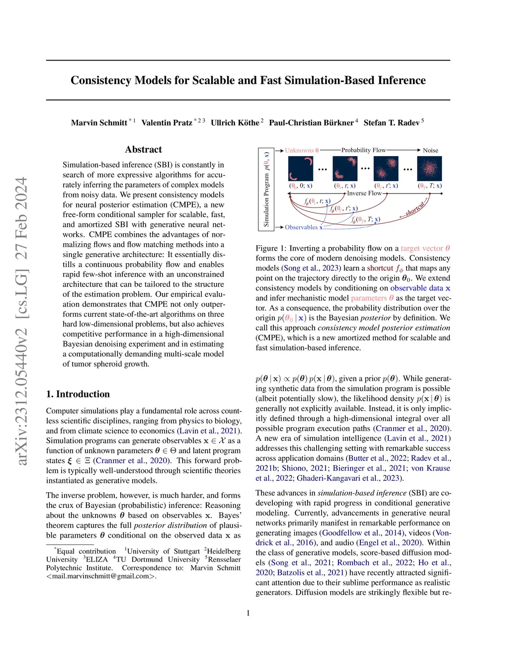 Simulation-based inference (SBI) is constantly in search of more expressive algorithms for accurately inferring the parameters of complex models from noisy data. We present consistency models for neural posterior estimation (CMPE), a new free-form conditional sampler for scalable, fast, and amortized SBI with generative neural networks. CMPE combines the advantages of normalizing flows and flow matching methods into a single generative architecture: It essentially distills a continuous probability flow and enables rapid few-shot inference with an unconstrained architecture that can be tailored to the structure of the estimation problem. Our empirical evaluation demonstrates that CMPE not only outperforms current state-of-the-art algorithms on three hard low-dimensional problems but also achieves competitive performance in a high-dimensional Bayesian denoising experiment and in estimating a computationally demanding multi-scale model of tumor spheroid growth.