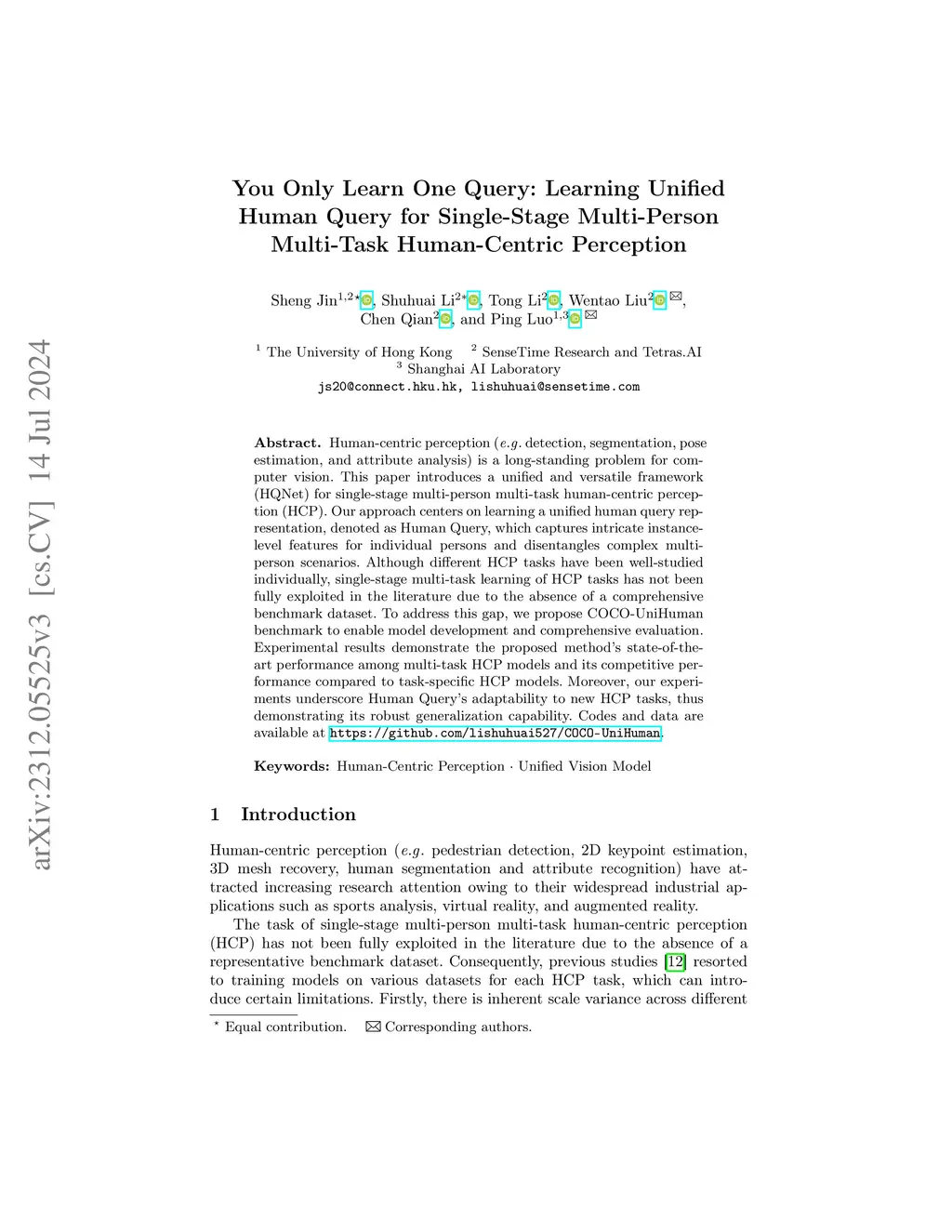 Human-centric perception (e.g. detection, segmentation, pose estimation, and attribute analysis) is a long-standing problem for computer vision. This paper introduces a unified and versatile framework (HQNet) for single-stage multi-person multi-task human-centric perception (HCP). Our approach centers on learning a unified human query representation, denoted as Human Query, which captures intricate instance-level features for individual persons and disentangles complex multi-person scenarios. Although different HCP tasks have been well-studied individually, single-stage multi-task learning of HCP tasks has not been fully exploited in the literature due to the absence of a comprehensive benchmark dataset. To address this gap, we propose COCO-UniHuman benchmark to enable model development and comprehensive evaluation. Experimental results demonstrate the proposed method's state-of-the-art performance among multi-task HCP models and its competitive performance compared to task-specific HCP models. Moreover, our experiments underscore Human Query's adaptability to new HCP tasks, thus demonstrating its robust generalization capability. Codes and data are available at https://github.com/lishuhuai527/COCO-UniHuman.