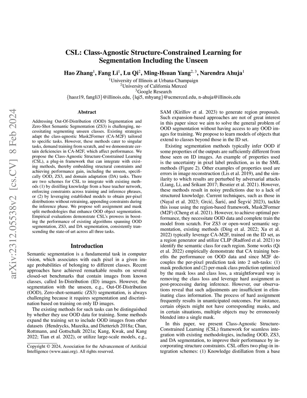 Addressing Out-Of-Distribution (OOD) Segmentation and Zero-Shot Semantic Segmentation (ZS3) is challenging, necessitating segmenting unseen classes. Existing strategies adapt the class-agnostic Mask2Former (CA-M2F) tailored to specific tasks. However, these methods cater to singular tasks, demand training from scratch, and we demonstrate certain deficiencies in CA-M2F, which affect performance. We propose the Class-Agnostic Structure-Constrained Learning (CSL), a plug-in framework that can integrate with existing methods, thereby embedding structural constraints and achieving performance gain, including the unseen, specifically OOD, ZS3, and domain adaptation (DA) tasks. There are two schemes for CSL to integrate with existing methods (1) by distilling knowledge from a base teacher network, enforcing constraints across training and inference phrases, or (2) by leveraging established models to obtain per-pixel distributions without retraining, appending constraints during the inference phase. We propose soft assignment and mask split methodologies that enhance OOD object segmentation. Empirical evaluations demonstrate CSL's prowess in boosting the performance of existing algorithms spanning OOD segmentation, ZS3, and DA segmentation, consistently transcending the state-of-art across all three tasks.