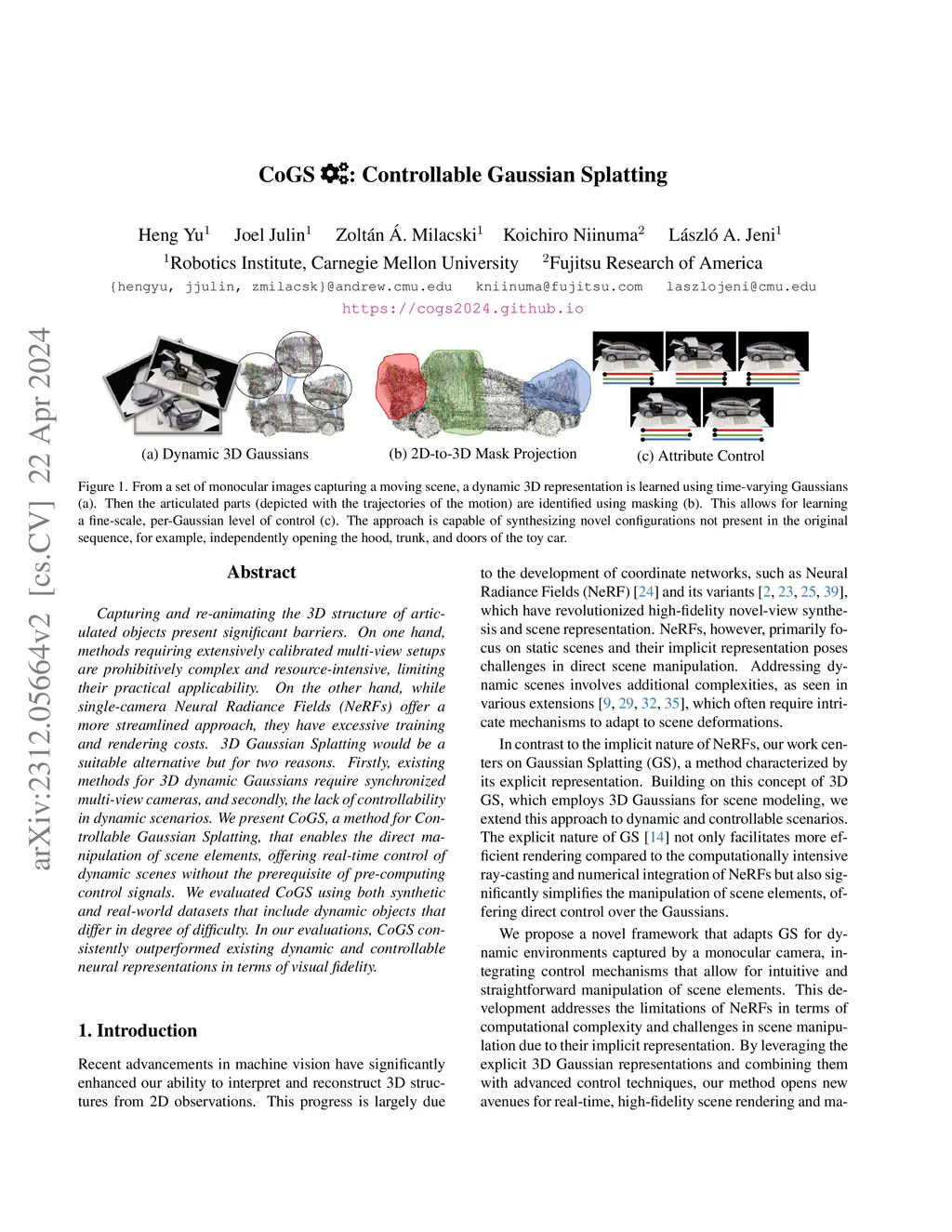 Capturing and re-animating the 3D structure of articulated objects present significant barriers. On one hand, methods requiring extensively calibrated multi-view setups are prohibitively complex and resource-intensive, limiting their practical applicability. On the other hand, while single-camera Neural Radiance Fields (NeRFs) offer a more streamlined approach, they have excessive training and rendering costs. 3D Gaussian Splatting would be a suitable alternative but for two reasons. Firstly, existing methods for 3D dynamic Gaussians require synchronized multi-view cameras, and secondly, the lack of controllability in dynamic scenarios. We present CoGS, a method for Controllable Gaussian Splatting, that enables the direct manipulation of scene elements, offering real-time control of dynamic scenes without the prerequisite of pre-computing control signals. We evaluated CoGS using both synthetic and real-world datasets that include dynamic objects that differ in degree of difficulty. In our evaluations, CoGS consistently outperformed existing dynamic and controllable neural representations in terms of visual fidelity.