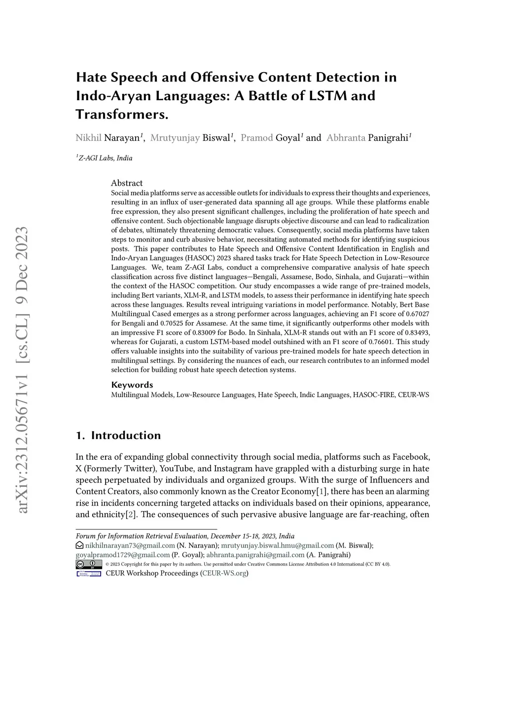 Social media platforms serve as accessible outlets for individuals to express their thoughts and experiences, resulting in an influx of user-generated data spanning all age groups. While these platforms enable free expression, they also present significant challenges, including the proliferation of hate speech and offensive content. Such objectionable language disrupts objective discourse and can lead to radicalization of debates, ultimately threatening democratic values. Consequently, organizations have taken steps to monitor and curb abusive behavior, necessitating automated methods for identifying suspicious posts. This paper contributes to Hate Speech and Offensive Content Identification in English and Indo-Aryan Languages (HASOC) 2023 shared tasks track. We, team Z-AGI Labs, conduct a comprehensive comparative analysis of hate speech classification across five distinct languages: Bengali, Assamese, Bodo, Sinhala, and Gujarati. Our study encompasses a wide range of pre-trained models, including Bert variants, XLM-R, and LSTM models, to assess their performance in identifying hate speech across these languages. Results reveal intriguing variations in model performance. Notably, Bert Base Multilingual Cased emerges as a strong performer across languages, achieving an F1 score of 0.67027 for Bengali and 0.70525 for Assamese. At the same time, it significantly outperforms other models with an impressive F1 score of 0.83009 for Bodo. In Sinhala, XLM-R stands out with an F1 score of 0.83493, whereas for Gujarati, a custom LSTM-based model outshined with an F1 score of 0.76601. This study offers valuable insights into the suitability of various pre-trained models for hate speech detection in multilingual settings. By considering the nuances of each, our research contributes to an informed model selection for building robust hate speech detection systems.